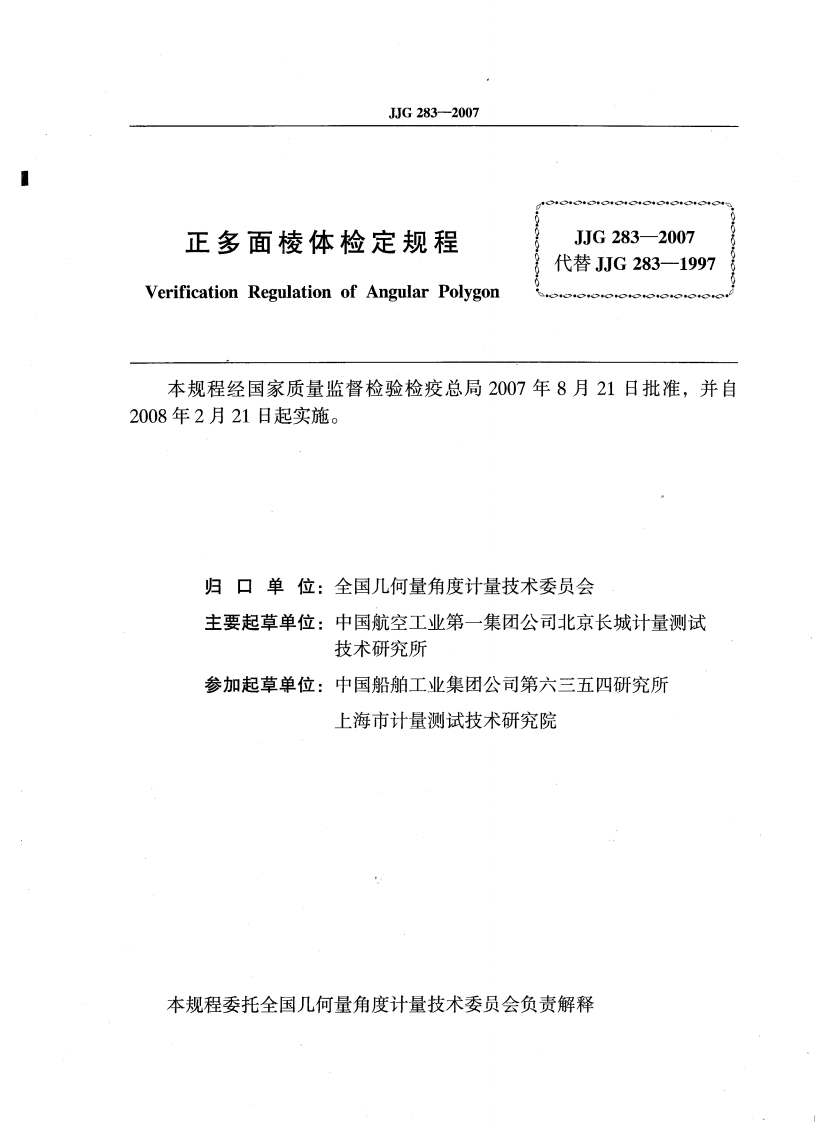 JJG300-2002小角度检查仪检定规程348072@abc4个月前发布关注私信0.66MB19页038JJG300-2002小角度检查仪检定规程此内容为付费资源,请付费后查看¥23¥34黄金会员免费钻石会员免费立即购买您当前未登录!建议登陆后购买,可保存购买订单付费资源 第1页 / 共19页 第2页 / 共19页 试读已结束,还剩17页,您可下载完整版后进行离线阅读 THE END标准规范 文本预览 可G中华人民共和国国家计量检定规程JJG283-2007正多面棱体Angular Polygon2007-08-21发布2008-02-21实施国家质量监督检验检疫总局发布 查看更多 收起部分 喜欢就支持一下吧收藏