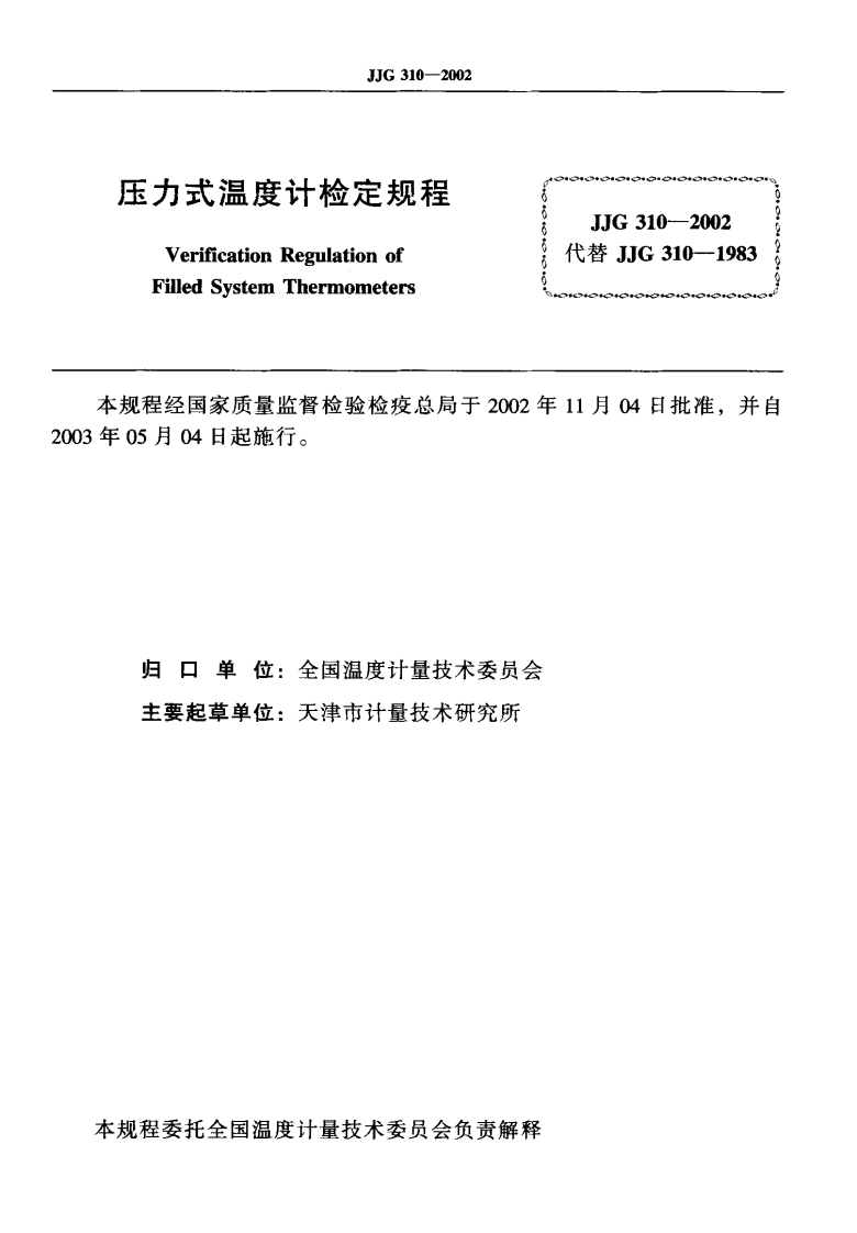 JJG310-2002压力式温度计348072@abc4个月前发布关注私信0.35MB14页023JJG310-2002压力式温度计此内容为付费资源,请付费后查看¥23¥34黄金会员免费钻石会员免费立即购买您当前未登录!建议登陆后购买,可保存购买订单付费资源 第1页 / 共14页 第2页 / 共14页 试读已结束,还剩12页,您可下载完整版后进行离线阅读 THE END标准规范 文本预览 JG中华人民共和国国家计量检定规程JJG310一2002压力式温度计Filled System Thermometers2002-11-04发布2003-05-04实施国家质量监督检验检疫总局发布 查看更多 收起部分 喜欢就支持一下吧收藏