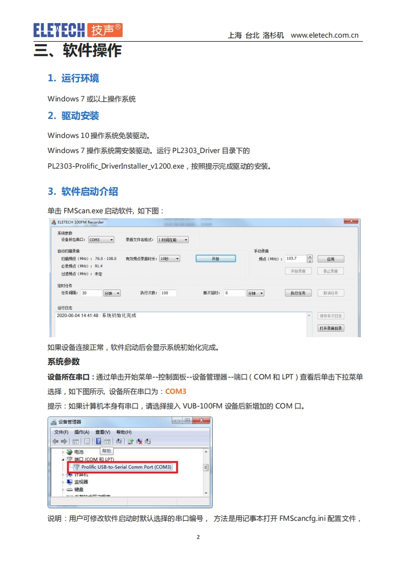 ELETECH技声®上海台北洛杉矶www.eletech.com.cn便携式调频电台扫描录音系统型号VUB-100FM包装清单1.VUB-100FM主机1台2.双头USB1连接线1根3.USB2连接线1根4.FM天线1根5.合格证保修卡1张6.说明书1份二、硬件连接1.设备接口介绍VUB-100FMUSB28SPEAKER ANTUSB1SPEAKER:喇叭开关。上拨为开,下拨为关。ANT:天线接口,适配灯笼头天线。USB1:录音控制,连接计算机USB2:扫描控制,连接计算机Q:耳机接口2.设备连接方法1.将FM天线接头插入VUB-100FM主机的ANT接口。2.将双头USB1连接线的一端接入VUB-100FM主机的USB1接口,另一端插入计算机的USB接口。3.将USB2连接线的3.5四段式插头插入VUB-100FM主机的USB2接口,另一端插入计算机的USB口。