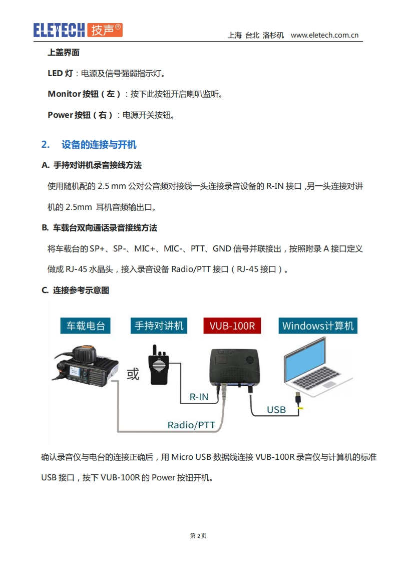 ELETECH技声®上海台北洛杉矶ww.eletech.com.cn对讲机电台录音系统使用手册3型号VUB-100R一、包装清单1.VUB-100R主机1台2.Micro USB数据线1根3.2.5毫米公对公音频连接线4.合格证保修卡1张5.说明书1份二、硬件介绍与连接1.设备接口介绍GAINVUB-100RR-IN⊕0RXTXVOLRadio/PTTUSBR-IN:电台音源输入接口,用带2.5毫米音频插头的对连线连接到对讲机2.5毫米耳机口。Radio,/PTT:对讲机录音音频输入口(线序定义请参考附录A)。RX GAIN:对讲机喇叭(接收)音频信号增益调节旋钮。TX GAIN:对讲机麦克风(发送)音频信号增益调节旋钮。VOL:监听音量输出控制旋钮。:耳机音频输出接口,连接耳机实时监听。USB:MicroUSB接口用于供电及与PC之间的通讯。第1页