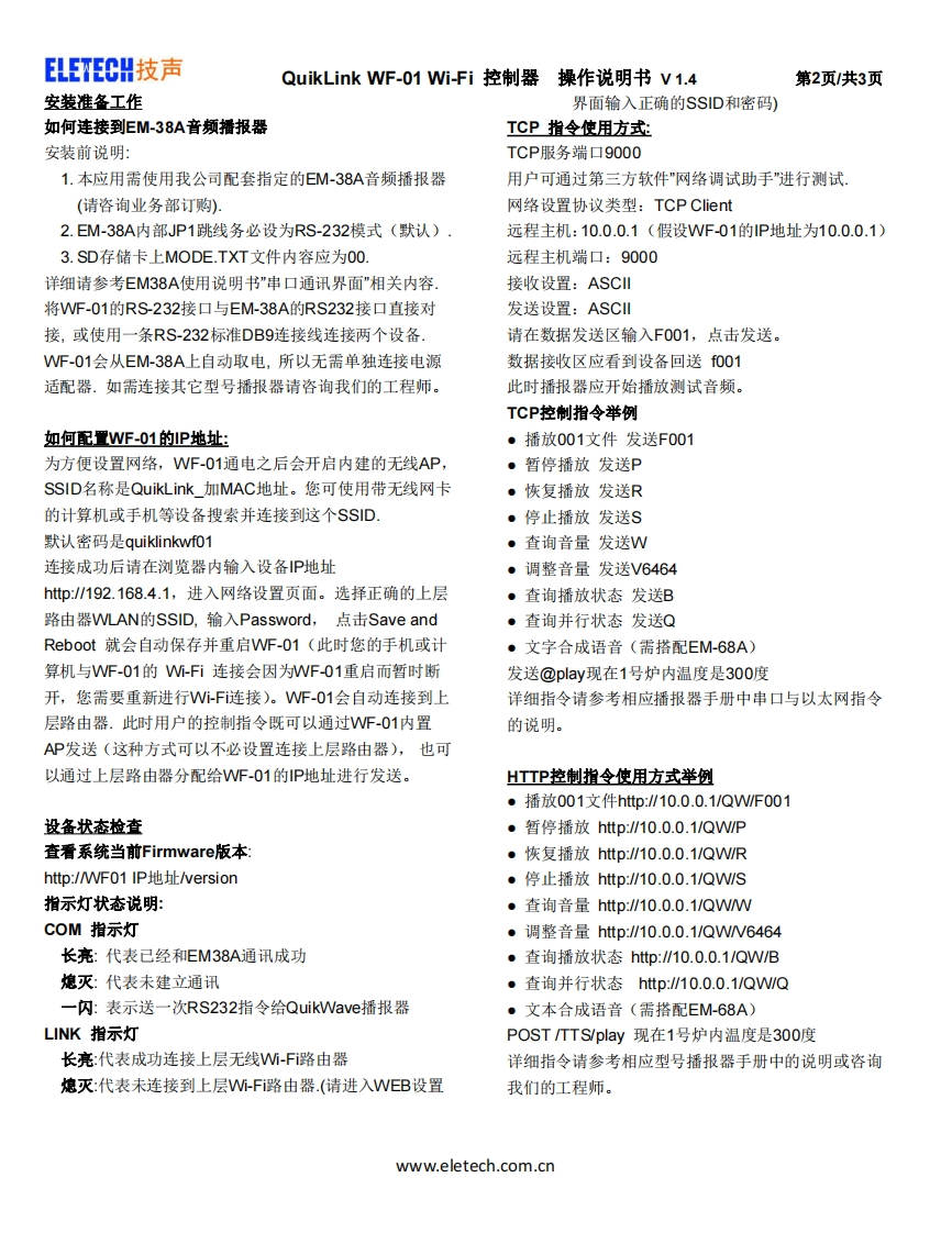 ELETECH技声QuikLink WF-01Wi-Fi控制器操作说明书V1.4第1页/共3页WF-01应用简介QuikLink TM WF-O1实现了通过Wi-Fi无线方式控制QuikWave播报器的功能,具有内置SSID,也可加入上层Wi-Fi(2.4GHz)无线局域网.设备内建TCP Server与Veb Server,为QuikWave音频播报器增加TCP控制指令和HTTP控制指令.使用户可以快速将音频播报器的控制功能集成到高级PLC控制系统或者计算机IT系统中。TCP控制接口WF-O1为EM-38A及EM-18A音频播报器提供了基于Wi-Fi连接的TCP控制协议.用户通过TCP客户端发送播放控制指令.可方便的将语音播报器控制功能集成到现有PLC系统或者T系统中。HTTP控制接口WF-O1为EM-38A及EM18A音频播报器提供了Wi-Fi环境HTTP协议的控制接口.用户通过HTTP发送播放控制指令.即可方便的将语音播报器控制功能集成到用户现有的Neb Server或浏览器及APP脚本中.WF-01+EM-68A语音合成播报器WF-O1搭配EM-68A语音合成播报器,使得您的系统可方便的通过基于W-Fi连接的TCP协议和HTTP协议将需要播报的文本内容发送给WF-01,EM-68A将自动合成语音并立即通过所连接的大功率喇叭播报,文本合成语音播报控制指令举例:TCP指令:发送@play现在1号炉内温度是300度说明:需配套EM-68A语音合成播报器,播报内容使用UTF-16-LE字符编码。每个字符占用2 bytesEM-38A-WiFi无线组网音频播报应用示意图语音维报蹈EM-38AAUDIO REPEATE酸1P:10.0.0.1EM-38A与WF-01组合PLC或服务器控制软件TCP及HTTP指令TCP指令F0O1语音港据晷http/10.0.0.1/Qw/F001EM-】AMDIO REPEATE国无线路由器1P:10.0.0.2Wi-Fi APLANEM-38A与WF-01组合语音循报M-3AO REPEATER1P:10.0.0.3EM-38A与WF-01组合www.eletech.com.cn