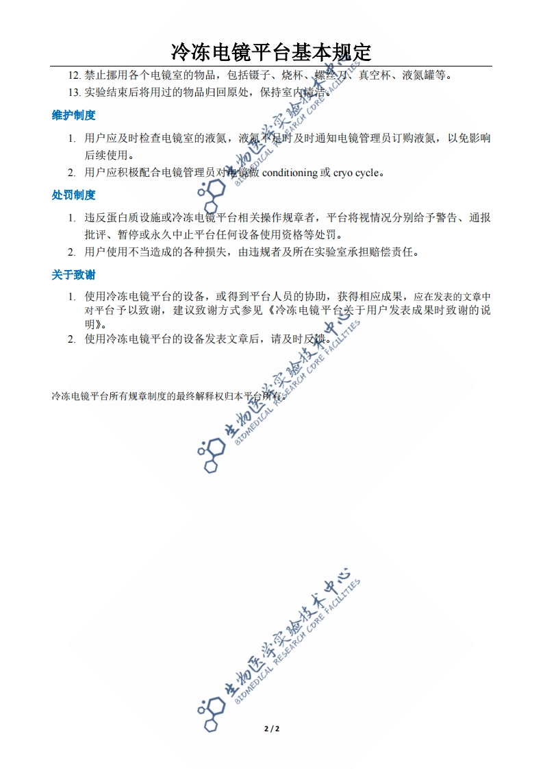 冷冻电镜平台基本规定安全制度1.严禁在实验室没人时开吹风机,严禁晚上开隊风机过夜。吹风机必须在低温低风速下使用,使用后应及时关闭,严禁用吹风膑易燃易变形老化的物品。2.严禁将门卡转借他人,如遇丢失,须花笔乎时间通知管理员。未及时报告造成严重后果的,责任由本人承担。3.严禁将食物和饮料带进设备间。)1通4.如遇紧急情况,危及人浚全时,应及时撤离,在保证自身安全的前提下报警。预约和登记制度I.用户可用帐号登录htp://share.westlake.edu.cn/genee/.网上预约系统预约平台设备。2.用户登录进入预约系统后,只能为本人预约设备。3.需使用冷冻转移系统时须在预约时予以注明。4.用户应严格按照预约时间使用平台设备,如果迟到半小时以上,管理员有权将机时分配给其他用户。5.用户预约了机时但因故取消,须至少提前一天通知管迎资,6.不符合条件的预约平台随时予以删除,用户使用前应检查预约是否成立。7.经常迟到或爽约者将进入黑名单,迟到或爽约造成不良后果者,平台将视情况予以处罚。8.用户迟到和爽约情况在各实验室的机死续冲予以特别注明抄送给所在实验室的导师。9.用户应严格认真填写使用登记本,缝纪信息必须真实。10.用户应严格认真填写故障记录设降界面信息要截屏保存。故障记录(时间、现象、原因及处置等)必须真实详尽术得隐瞒,并及时报告管理员。使用制度1.用户须在签署承诺书后方可使用平台设备。2.用户使用仪器前必须熟知相应仪器的操作手册及使用须知。3.用户须在指定帐号下操作电镜,禁止使用他人帐号。4.用户须按照相应级别权限使用电镜,严禁进行本人权限外的操作。自身级别不够或对仪器使用无完全把握者,不得随意提供指导,否则将负有连带责任。5.使用仪器前应检查仪器状态,察看上一人使用记录及故障记录,如有问题应及时报告管理员,以便甄别问题责任人。6.仪器使用中如出现问题,须第一时间通知管理员小在管理员知情的前提下再联系其他老师、助管或FEI工程师解决问题,严禁擅处理。7.用户应爱惜平台设备,禁止粗暴野查操8.严禁擅自修改仪器的各项参数。9.严禁擅自在平台设备上使用U盘①核动硬盘等外来设备。10.严禁擅自在平台设备上安装和海你外来软件。11.禁止使用高强度的beam心射相机及用相机拍摄高强度衍射花样。1/2
