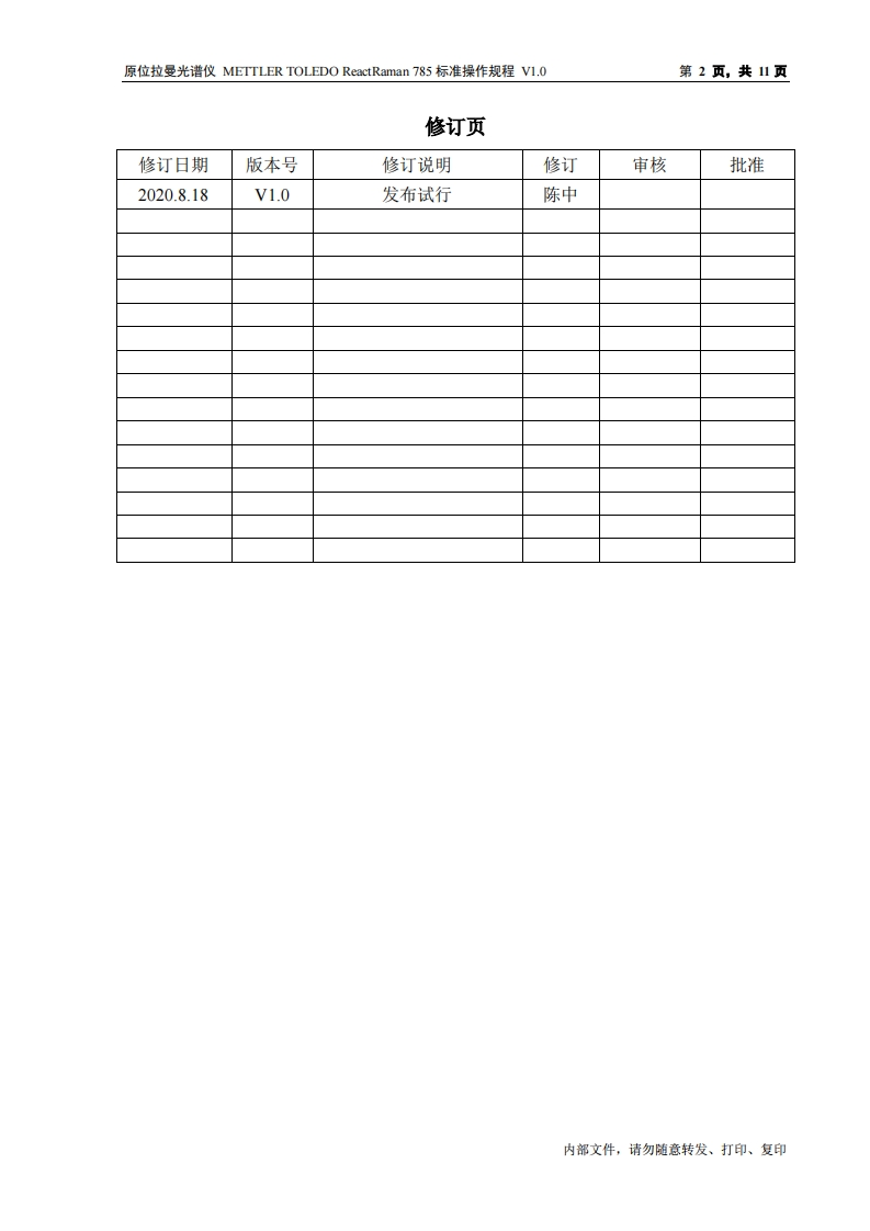 原位拉曼光谱仪-METTLER-TOLEDO-ReactRaman-785-标准操作规程348072@abc6天前发布关注私信1.16MB11页020原位拉曼光谱仪-METTLER-TOLEDO-ReactRaman-785-标准操作规程此内容为付费资源,请付费后查看¥39¥49黄金会员免费钻石会员免费立即购买您当前未登录!建议登陆后购买,可保存购买订单付费资源 第1页 / 共11页 第2页 / 共11页 试读已结束,还剩9页,您可下载完整版后进行离线阅读 THE END仪器仪表 文本预览 原位拉曼光谱仪METTLER TOLEDO ReactRaman785标准操作规程V1.0第1页,共1页文件编号:Q/WU FLHA19100040R019版本号:V1.0受控状态:分发号:分子科学公共实验平台质量管理文件原位拉曼光谱仪METTLER TOLEDO ReactRaman 785标准操作规程2020年9月1日发布年月日实施分子科学公共实验平台发布内部文件,请勿随意转发、打印、复印 查看更多 收起部分 喜欢就支持一下吧收藏