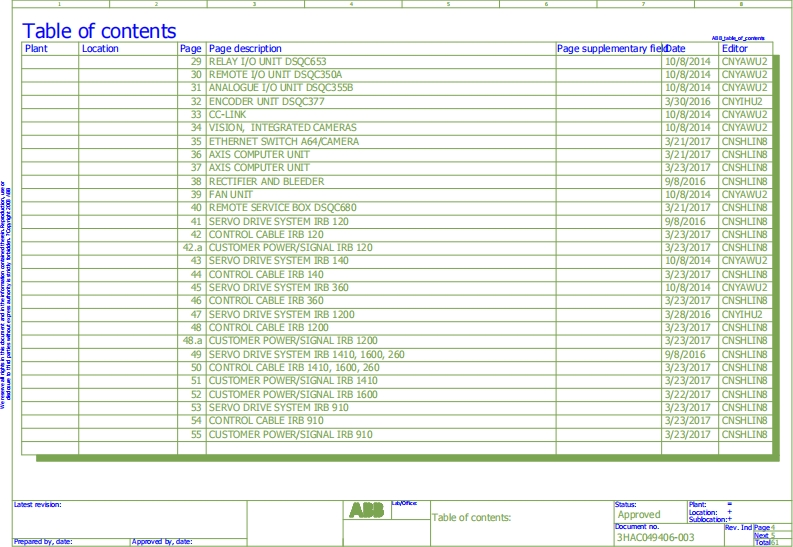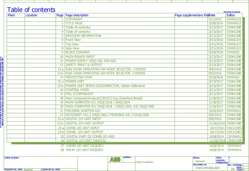 The infommation in this document is subject to change without notice and should not be construed as acommitment by ABB.ABB assumes no responsibility for any errors that may appear in this document.Except as may be expressly stated anywhere in this document,nothing herein shall be construed as anykind of guarantee or warranty by ABB for losses,damages to persons or property,fitness for aspedfic purpose or the like.In no event shall ABB be liable for incidental or consequential damages arising from use of this document.This docment and parts thereof must not be reproduced or copied without ABB's written permission,and contents therof must not be imparted to a third party nor be used for any unauthorized purpose.Contravention will be prosecuted.Additional copies of this document may be obtained from ABB at its then current charge.Copyright 2016 ABB ALL right reserved.ABB Engineering (Shanghai)No.4528,Kangxin Highway,Kangqiao TownNanhui District,Shanghai,201319P.R.China3ee名0nT:tCOPYRIGHTApprovedCocument no.Rev.Ind Page 1Prepared by,dsve:Beginner Approved by,dste:3HAC049406-003068