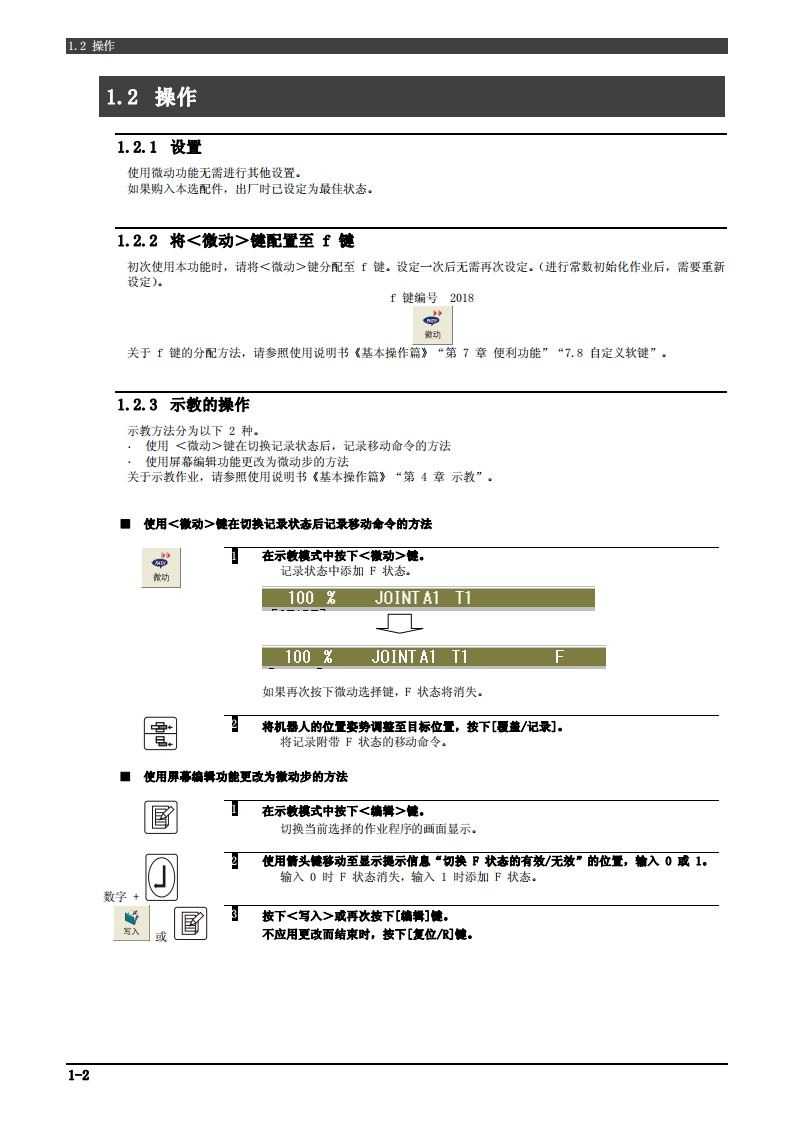 310,TFDC-067-001,00☑NACHIFD控制装置操作说明书微动功能第1版·在使用机器人之前,请详读本操作说明书,并请遵从所有关于安全事项与正文的指示。·关于本机器人的安装、操作、维修,请仅由接受过本公司机器人讲习的人员进行。·在使用本机器人的时候,必须遵守各个国家有关工业机器人的法律以及安全相关的法律条例。·务必将本操作说明书交付给实际操作的人员。·有关本操作说明书的不明之处以及有关本机器人的售后服务,请向记载在封底中的敝社的服务中心查询。株式会社不二越