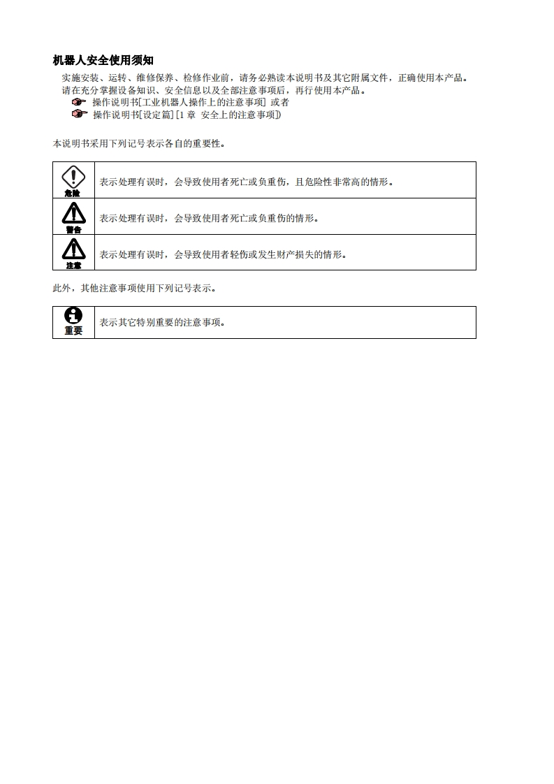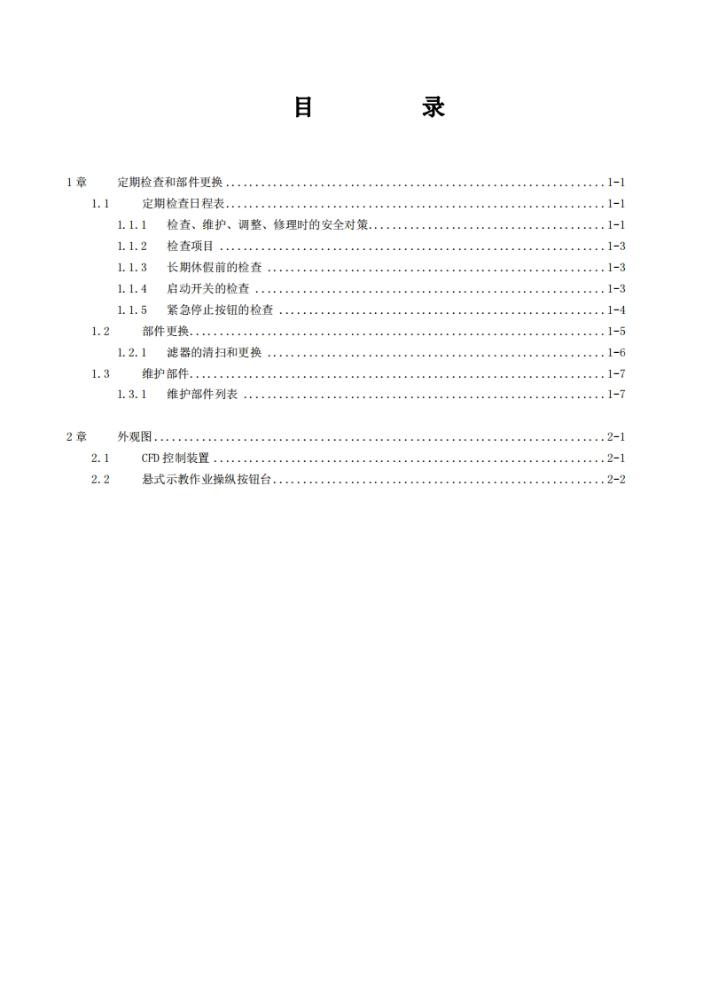 1501,ECFCN-007-002,001NACHICFD控制装置操作说明书控制装置维护篇第2版·在使用机器人之前,请详读本操作说明书,并请遵从所有关于安全事项与正文的指示。·关于本机器人的安装、操作、维修,请仅由接受过本公司机器人讲习的人员进行。·在使用本机器人的时候,必须遵守各个国家有关工业机器人的法律以及安全相关的法律条例。·务必将本操作说明书交付给实际操作的人员。•有关本操作说明书的不明之处以及有关本机器人的售后服务,请向记载在封底中的敝社的服务中心查询。株式会社不二越