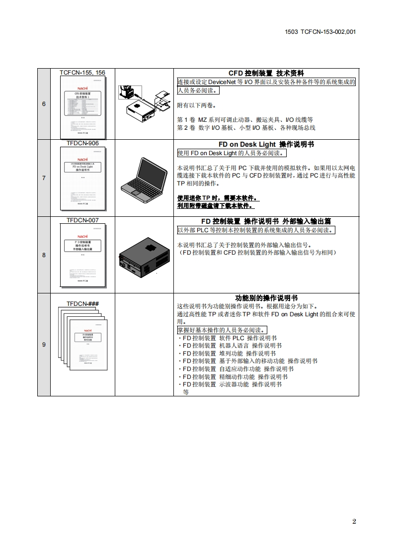 1503 TCFCN-153-002.001CFD控制装置操作说明书的结构标准说明书TCFCN-159CFD控制装置操作说明书设定篇如果进行CFD控制装置与机器人的连接、机器人的初始设定等操作NACHI时,请阅读本说明书。定日1本说明书汇总了关于控制装置和机器人的基本设定顺序(工具设定、作业原点登录和以太网设定等)以及安全相关信号的连接方法。·使用迷你TP的顾客应准备PC用软件“FD on Desk Light”。TCFCN-160CFD控制装置操作说明书基本操作篇通过CFD控制装制进行示教、再生以及文件操作时,请阅读本说明NACHi书。本说明书汇总了关于以悬式示教作业操纵按钮台进行示教(编程)、2W:再生(自动运转)以及文件操作等内容。另外汇总了通过外部输入信号进行再生(自动运转)操作的方法。,使用迷你TP的顾客应准备PC用软件“FD on Desk Light”。ECFCN-007CFD控制装置操作说明书控制装置维护篇负责维护CFD控制装置的人员务必阅读。NACH本说明书汇总了关于CFD控制装置的基本维护。包括备件一览。3,关于规格的详情请参照“标准规格书”。操作说明书机器人主体篇负责维修机器人主体的人员务必阅读。MZ04 MMCCN-288本说明书汇总了关于机器人主体的基本规格和维修。4MZ07 MMZCN-265MC10S:MMCCN-282包括备件一览。·关于规格的详情请参照“标准规格书”。ECFCN-008CFD控制装置操作说明书错误代码表负责维修的人员务必阅读。本说明书汇总了关于错误内容和故障排除。51