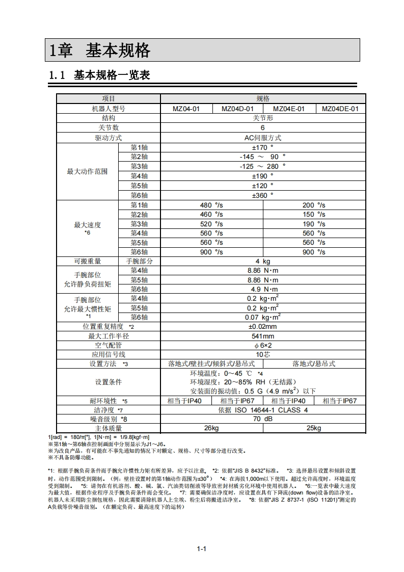 508,MM20-288-003,00☑NACHi操作说明书机器人主体Mz04-01/MZ04E-01[CFD]MZ04D-01/MZ04DE-01 [CFD]第3版·在使用机器人之前,请详读本操作说明书,并请遵从所有关于安全事项与正文的指示。·关于本机器人的安装、操作、维修,请仅由接受过本公司机器人讲习的人员进行。·在使用本机器人的时候,必须遵守各个国家有关工业机器人的法律以及安全相关的法律条例。·务必将本操作说明书交付给实际操作的人员。·有关本操作说明书的不明之处以及有关本机器人的售后服务,请向记载在封底中的敝社的服务中心查询。株式会社不二越