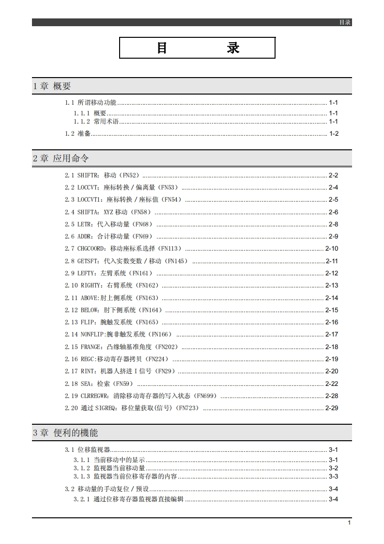1311,TFDC-162-001,001NACHICFD控制装置操作说明书移动功能第1版·在使用机器人之前,请详读本操作说明书,并请遵从所有关于安全事项与正文的指示。·关于本机器人的安装、操作、维修,请仅由接受过本公司机器人讲习的人员进行。·在使用本机器人的时候,必须遵守各个国家有关工业机器人的法律以及安全相关的法律条例。·务必将本操作说明书交付给实际操作的人员。·有关本操作说明书的不明之处以及有关本机器人的售后服务,请向记载在封底中的敝社的服务中心查询。株式会社不二越
