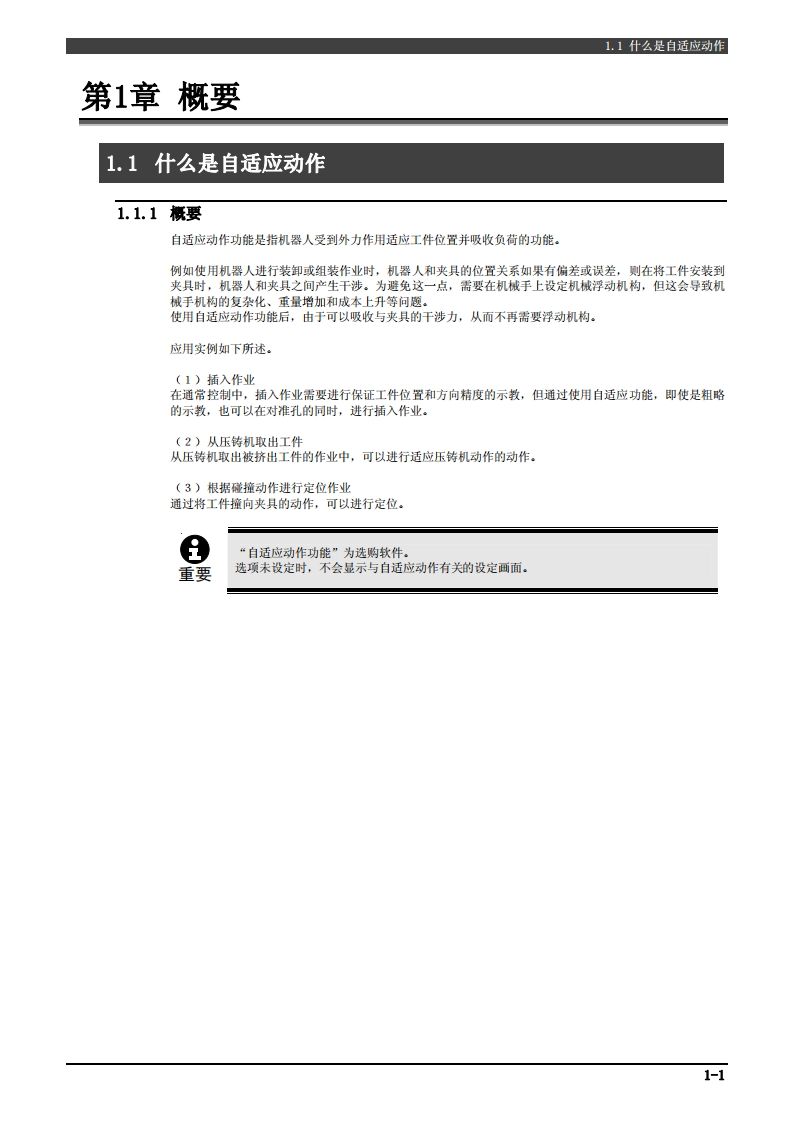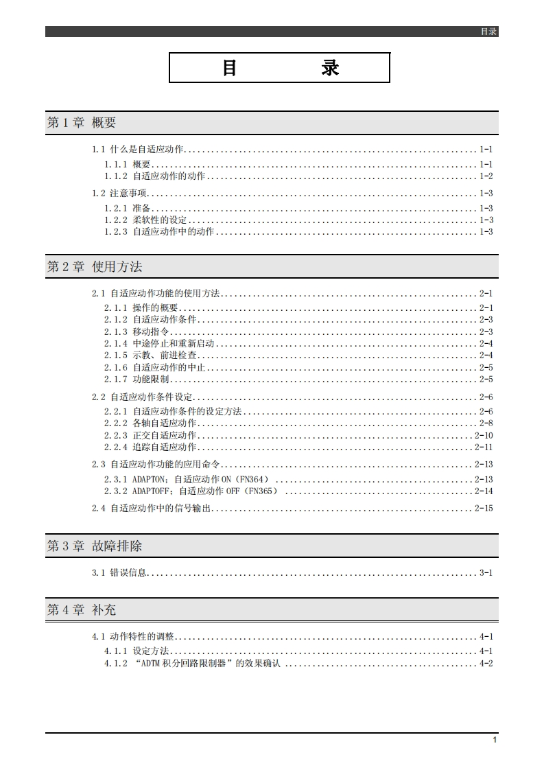 1209,TFDN-124-001,001NACHIFD控制装置操作说明书自适应动作功能第1版·使用机器人之前,务必仔细阅读本操作说明书,遵守所有的安全相关事项并按照本文的指示进行操作。·只限接受过相应培训的人员可以对本机器人进行相关处理(安装、操作、维护等)。·使用本机器人时,务必遵守各国的工业机器人相关法律及安全相关法律。·务必将本说明书发给实际进行操作的人员。·对本说明书的疑点及本机器人的售后服务,请咨询封底所述的本公司各服务中心。株式会社不二越