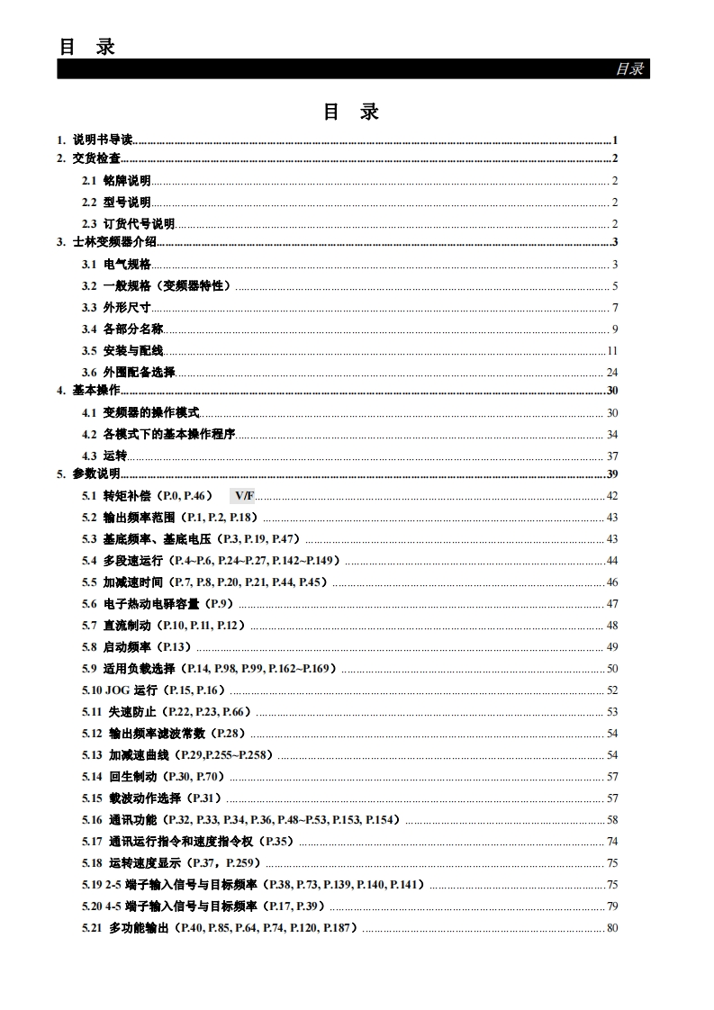 安全注意事项安全注意事顶使用士林变频器时请遵守以下相关安全事项,以确保用户自身与他人之安全。以下注意事项将会有图型代号区分标记说明:危险此图形表示危险事项,若不慎操作可能会导致死亡或重伤。注意此图形表示注意事项,若不慎操作可能会造成伤害或财产损失。此图型表示需注意且应实施之图形,请依说明确实操作。●请勿存放于有腐蚀性气体、有水、引燃气体之场合操作变频器。操作时请远离可燃物或爆裂物。●震动或摇晃激烈场合请不要放置变频器。●导线请勿浸泡在油、水之下进行操作。禁止于变频器通电中用身体碰触变频器内部任何部分,以免触电。●三相电源不可接至U/T1、V/T2、W/T3端。危险变频器端子白务必正确的接地。通电时请勿进行配线操作。●请勿对变频器内部的零件进行耐压测试,因变频器所使用的半导体易受高压而损坏。●变频器的电路板有CMOS IC极易受静电的破坏,故在未做好静电措施前请勿用手触摸电路板。●即使马达是停止的,变频器的主回路端子仍然可能带有危险的高压。只有合格的电机专业人员才可以安装、配线及修理保养变频器。●当变频器某些功能被设定后,可能电源输入后会立即启动马达开始运转。注意●请选择安全区域来安装变频器,防止高温及日光直接照射,避免湿气和水滴的泼溅。●当变频器与马达之间配线过长时,对马达的层间绝缘可能产生破坏,可在变频器与马达间加装电抗器,避免绝缘破坏而损毁。变频器安装电源系统额定电压220系列机种不可高于240V:440系列机种不可高于480V。●配线时应由专业配线人员进行配线作业。●安装的方向与方法请依规定进行安装。使用时请确保使用温度在安全范围内。请遵守操作使用电压。●运转有问题时,请先卸下马达,待空载运转没问题后,再接上机台。●请确认拿到之变频器功率与马达功率是否符合。●运转前,请先确认紧急开关是否可正常运作。●电源线与U、V、W线与讯号线不宜绞线在一起,应尽量分开。●长时间不操作请关闭电源。