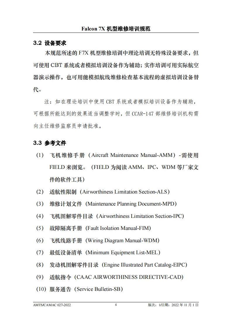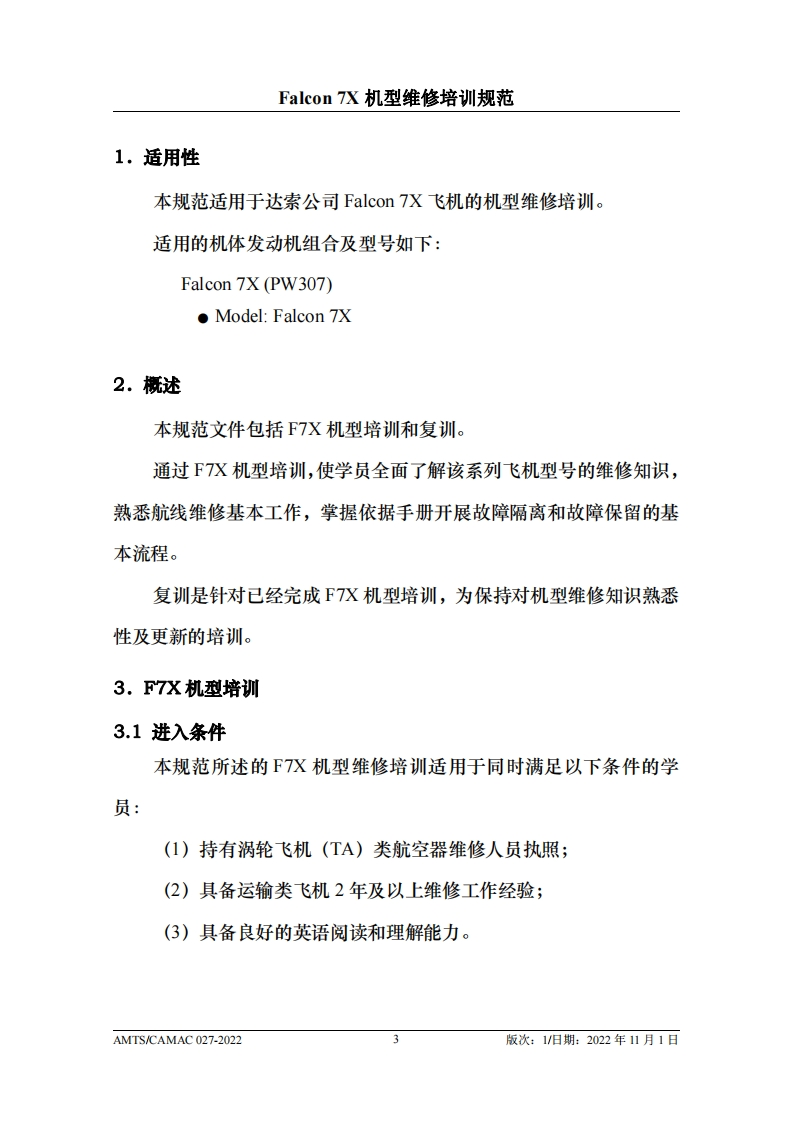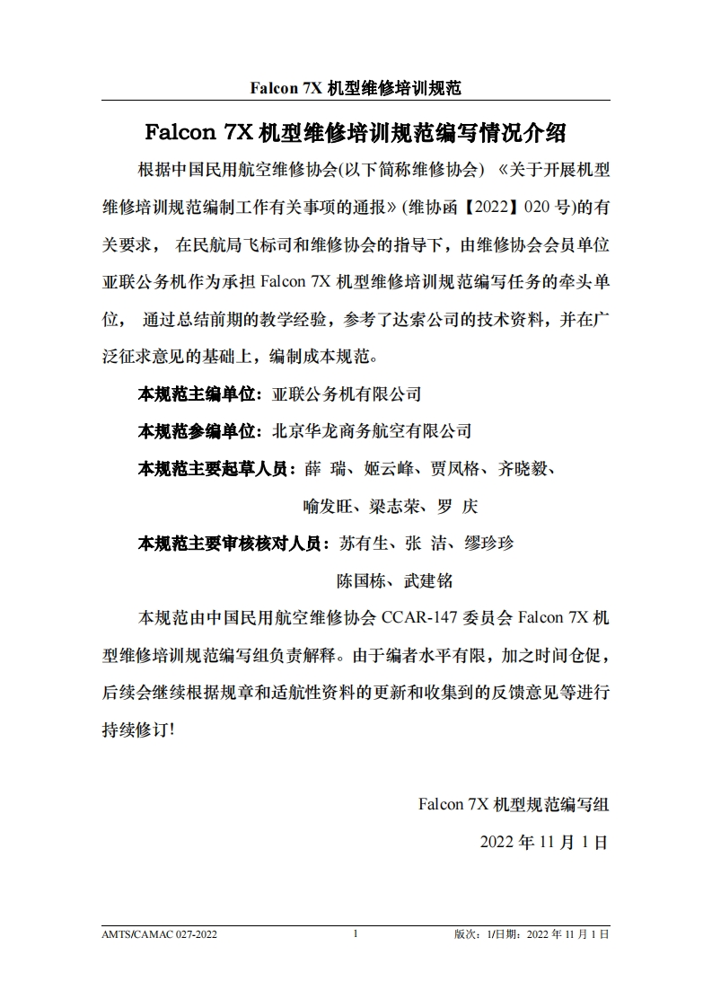 CAH光中国民用航空维修协会Falcon 7X机型维修培训规范AMTS/CAMAC 027-2022第1版/2022年11月1日本文件由中国民用航空维修协会民航维修培训机构工作委员会(CCAR-147委员会)编制,并经中国民用航空局航空器评审组(AEG)的认可。航空运营人、维修单位或维修培训机构在开展机型维修培训时可参考本文件制定相应的机型维修培训教学大纲。本文件将根据Falcon7X机型的设计更改和使用反馈进行修订,请上述相关方子以及时关注,以评估对所编制教学大纲的影响。