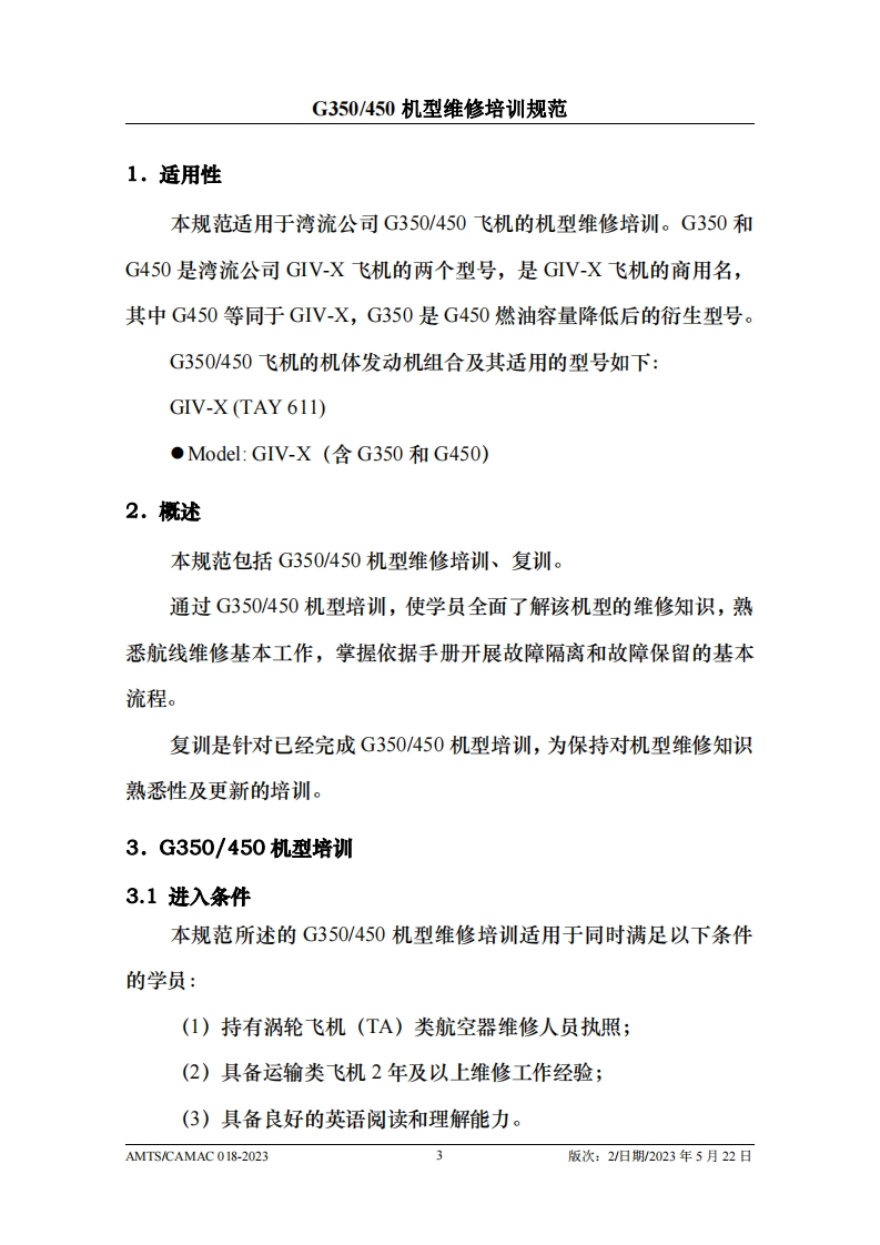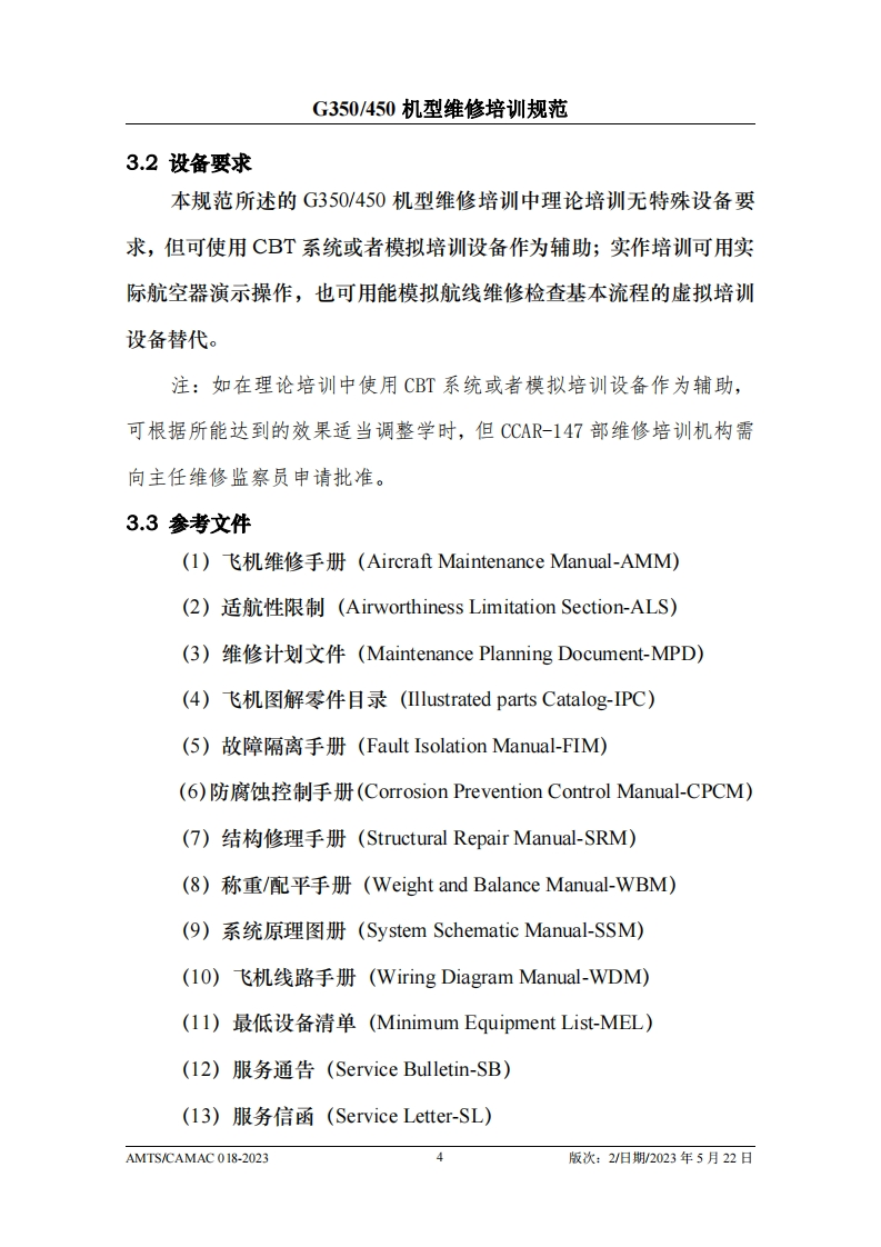 CAMEE中国民用航空维修协会G350/450机型维修培训规范AMTS/CAMAC 018-2023第2版/2023年5月22日本文件由中国民用航空维修协会民航维修培训机构工作委员会(CCAR-147委员会)编制,并经中国民用航空局航空器评审组(AEG)的认可。航空运营人、维修单位或维修培训机构在开展机型维修培训时可参考本文件制定相应的机型维修培训教学大纲。本文件将根据G350/450机型的设计更改和使用反馈进行修订,请上述相关方予以及时关注,以评估对所编制教学大纲的影响。