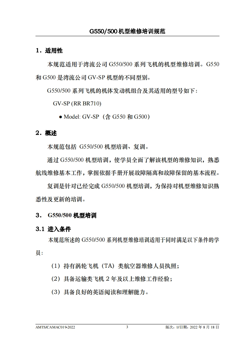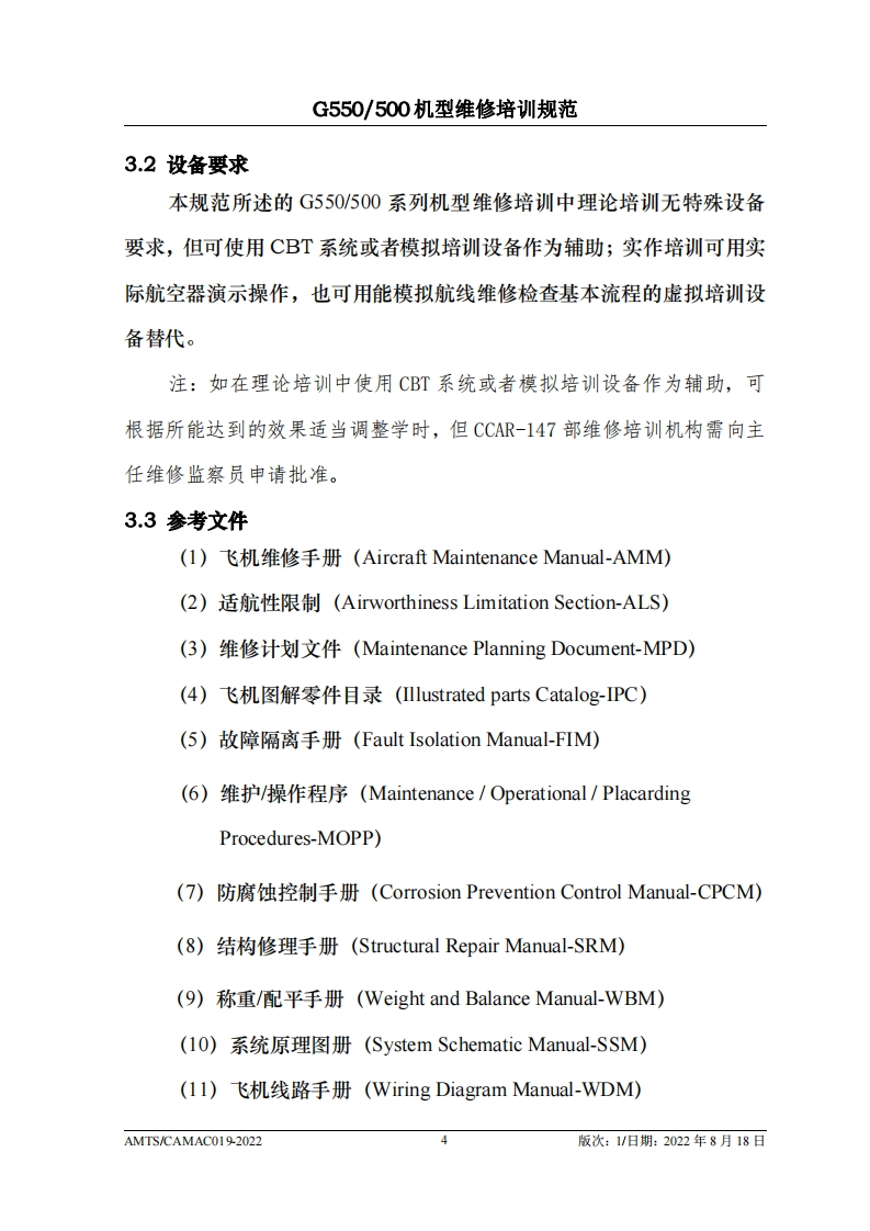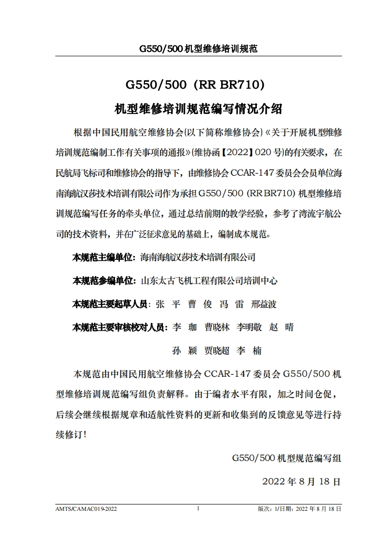 CA光中国民用航空维修协会G550/500机型维修培训规范AMTS/CAMACO19-2022第1版/2022年8月18日文件由中国民用航空维修协会民航维修培训机构工作委员会(CCAR-147委员会)编制,并经中国民用航空局航空器评审组(AEG)的认可。航空运营人、维修单位或维修培训机构在开展机型维修培训时可参考本文件制定相应的机型维修培训教学大纲。本文件将根据G550/500机型的设计更改和使用反馈进行修订,请上述相关方子以及时关注,以评估对所编制教学大纲的影响。