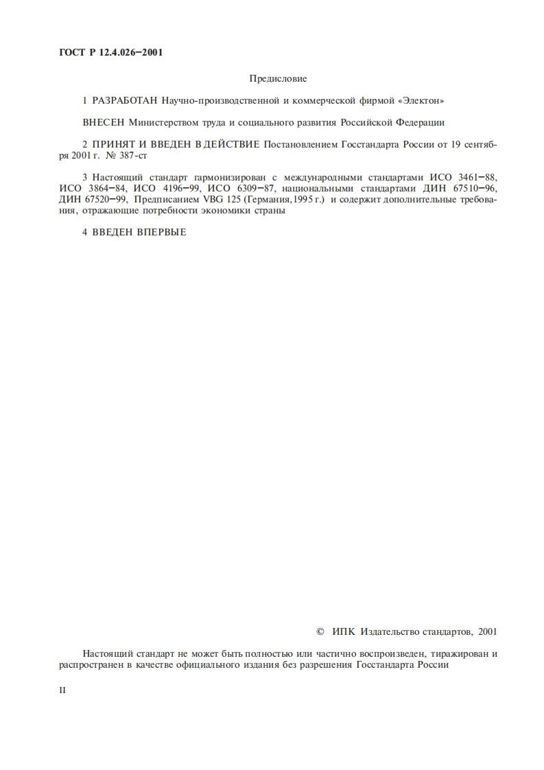 T0CTP12.4.026-2001TOCYIAPCTBEHHEIN CTAHIAPT POCCHNCKON PEIEPAINICucrema cTaHapToB oe3onacHocrn TpyaIIBETA CHTHAJIbHbIE,3HAKMBE3OIACHOCTI M PA3METKACHTHAJIBHAAHa3HayeHne n npaBna npnMeHeHna.Oomne TexHHyeckne TpeooBaHna H xapakTepHcTHKn.MeToIbI HenbITaHniM3 aHme o中HIaJbHoe1001002-9TOCCTAHIAPT POCCHNMocKBa