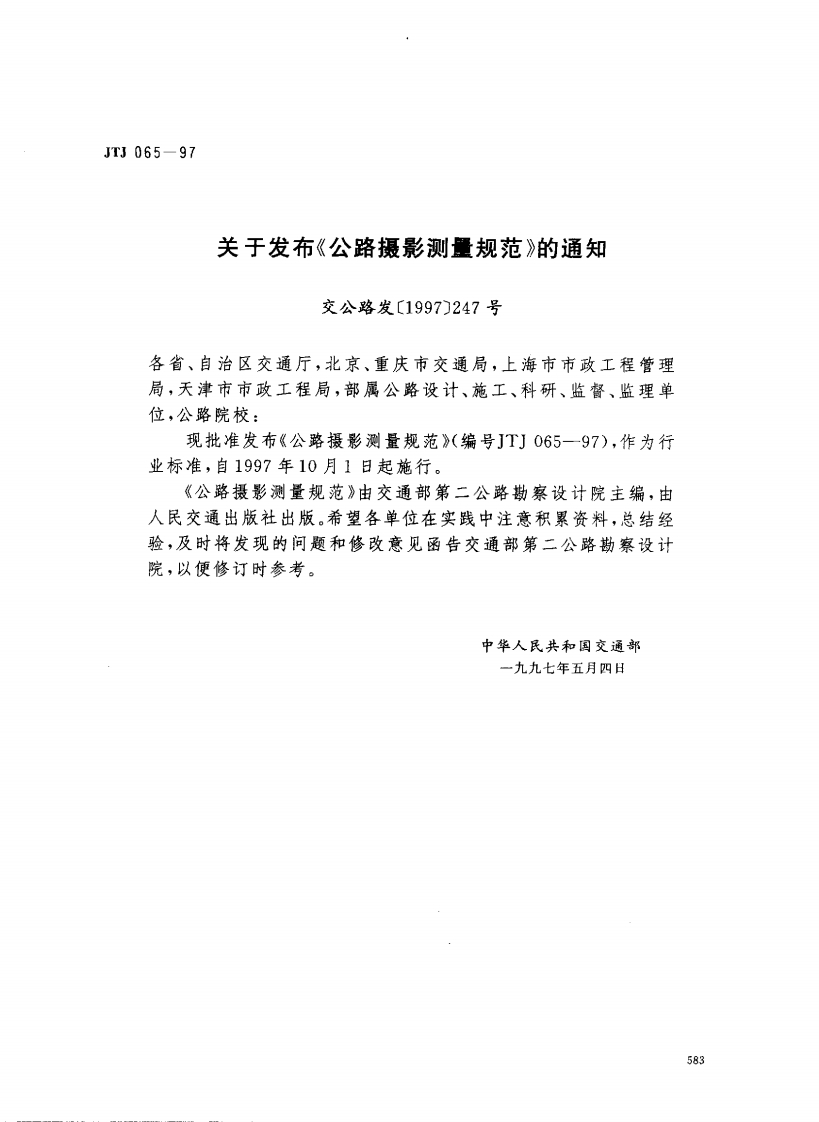JTJ065-97公路摄影测量规范348072@abc4个月前发布关注私信2.39MB60页027JTJ065-97公路摄影测量规范此内容为付费资源,请付费后查看¥13¥23黄金会员免费钻石会员免费立即购买您当前未登录!建议登陆后购买,可保存购买订单付费资源 第1页 / 共60页 第2页 / 共60页 试读已结束,还剩58页,您可下载完整版后进行离线阅读 THE END标准规范 文本预览 中华人民共和国交通行业标准公路摄影测量规范Specifications for highway photogrammetryJTJ065一97主编单位:交通部第二公路勘察设计院批准部门:中华人民共和国交通部施行日期:1997年10月1日582 查看更多 收起部分 喜欢就支持一下吧收藏