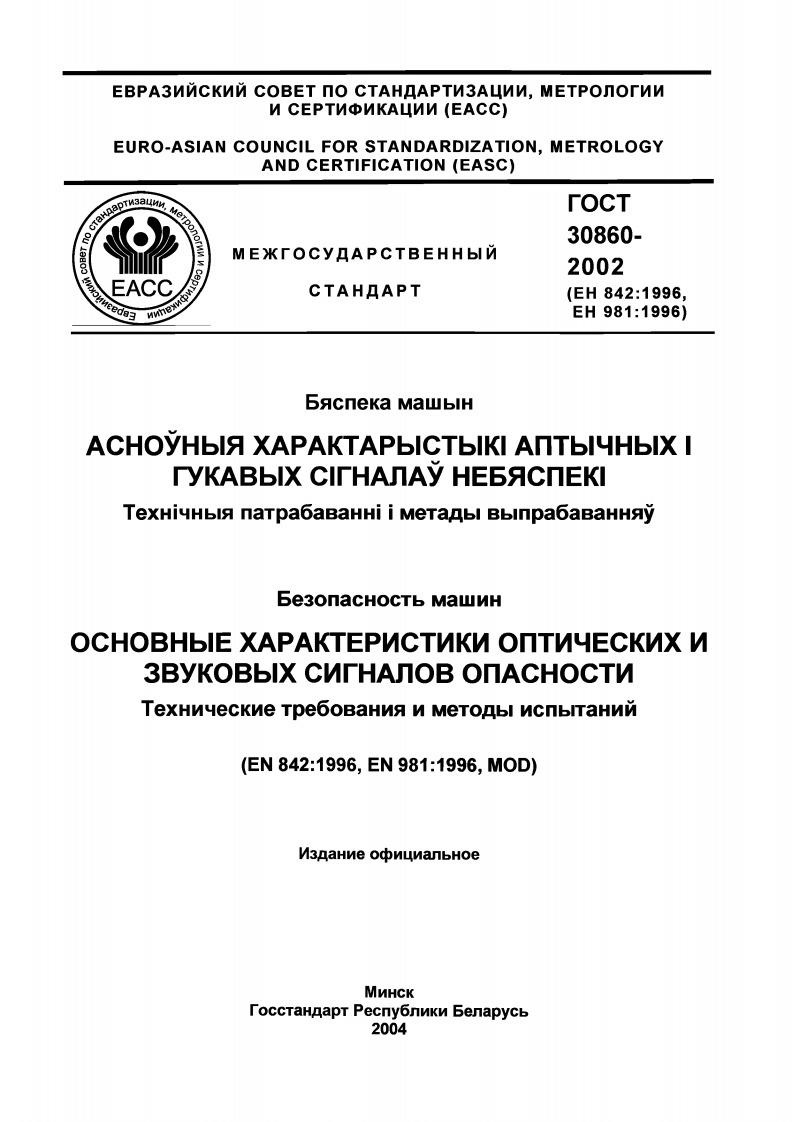MEXKrOCYAAPCTBEHHbIN「0cT30860-2002CTAHAAPT(EH842:1996,EH981:1996)Be3onacHOCTb MawNHOCHOBHbIE XAPAKTEPNCTNKN ONTNYECKMX M3ByKOBbIX CNTHAJOB ONACHOCTNTexHnyeckne Tpe6oBaHnA N MeToAbI ncnbITaHnMBacneka MawbIHACHOyHbIA XAPAKTAPbICTbIKI ANTbIYHbIX ITyKABbIX CITHANAy HEBACNEKITexHiYHbla naTpabaBaHHi i MeTanbl BbinpabaBaHHay(EN842:1996,EN981:1996,MOD)M3 naHne oφM4 nanbHoe2222☒MexrocyAapcTBeHHbIn coBeT noCTaHAapTn3aunn,MeTponorn McepTnc中MKa4WWMNHCK