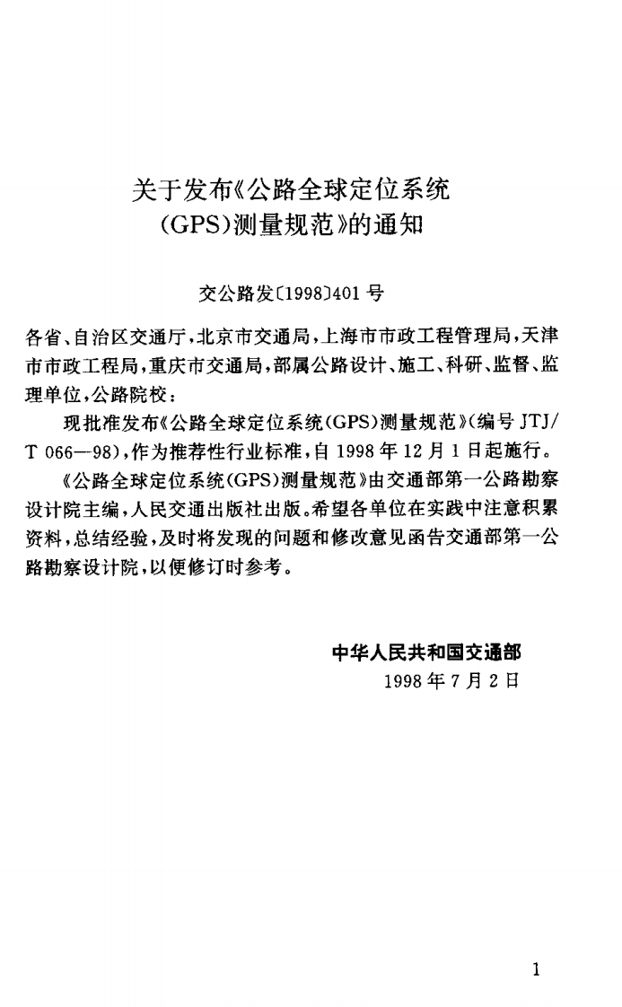 JTJ066T-98公路全球定位系统(GPS)测量规范348072@abc4个月前发布关注私信0.73MB38页042JTJ066T-98公路全球定位系统(GPS)测量规范此内容为付费资源,请付费后查看¥13¥23黄金会员免费钻石会员免费立即购买您当前未登录!建议登陆后购买,可保存购买订单付费资源 第1页 / 共38页 第2页 / 共38页 试读已结束,还剩36页,您可下载完整版后进行离线阅读 THE END标准规范 文本预览 工测员surmap.com中华人民共和国行业标准公路全球定位系统(GPS)测量规范Global Positioning System (GPS)SurveySpecifications for HighwayJTJ/T066一98主编单位:交通部第一公路勘察设计院批准单位:中华人民共和国交通部施行日期:1998年12月1日 查看更多 收起部分 喜欢就支持一下吧收藏