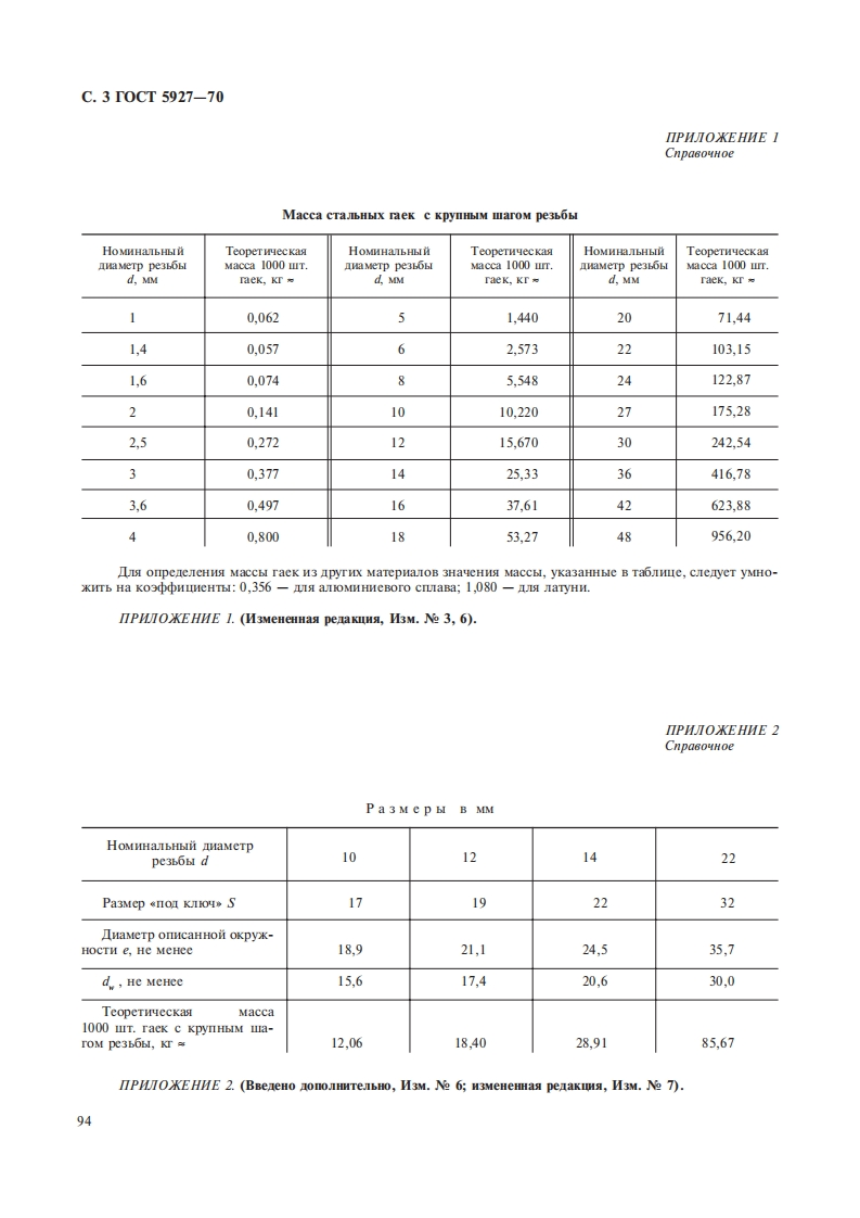 Tpyma T33TOC yIA P C T BEHH BIH C TAHIA PTCOIO3ACCPTANKN IIIECTHTPAHHLIEKJIACCA TOYHOCTH ATOCTKoHCTpyKuna H pa3Mepbl5927-70Hexagon nuts,product grade A.(CTC3B3680-82)Construction and dimensions0KT128300Mara BBeaeHHs 01.01.72B yacTH pa3Mepa eno1 KJo*S=13 MM01.01.731.HacTogumi cTaHnapT pacnpocTpaHgeTca Ha mecTHrpaHHble raiKn Knacca TOUHOCTH A c HaMeT-poM pe3b6bI OT 1 0 48 MM.CTaHapT noHOCTbIO CooTBeTCTByeT CT C3B 3680-82(M3MeHeHHaa penaKnma,M3M.No 4).2.KoHCTpyKuHa H pa3mepbl raek IOKHbI COOTBeTCTBOBaTb yKa3aHHbIM Ha yepTexe H B Taomue.(M3MeHeHHaa penaKnna,M3M.Ne 3,4,6,7).3.Pe3b6a-no TOCT 24705.(M3MeHeHHaa penaKuma,M3M.Ne 2,4,5).3a.He ycTaHoBneHHble HacTosIMM cTaHnapToM nomycKn pa3MepoB,OTKIOHeHHi opMbI H pacno-JoxeHHa nOBepxHocTei H MeTObI KOHTpona-no TOCT 1759.1.36.HonycTHMble nedeKTbI noBepxHoCTH raek H MeTOIbI KOHTpons-no TOCT 1759.3.3a,36.(BBeneHbl ononHnTenbHO,M3M.Ne 5).4.JonyckaeTca no corjameHmIo Mexly H3rOTOBHTeneM H noTpeonTeneM H3rOTaBJIHBaTb raiikn cHOMHHaJIbHbIM IHaMeTpoM pe3b6bI OT 36 0 48 MM c IaroM pe3b6bI 2 MM.(M3MeHeHHaa penaKuma,M3M.Ne 2,5).5.TexHnuecKHe Tpe6oBaHHs-no TOCT 1759.0.6.(MckmoyeH,M3M.Ne 2).7.Macca raek yka3aHa B npwoxeHHM 1.8.(NckmoyeH,M3M.Ne 4).15.30021-06m3 aHHe o中MHaIbHoeIepeneqarka Bocnpemena92