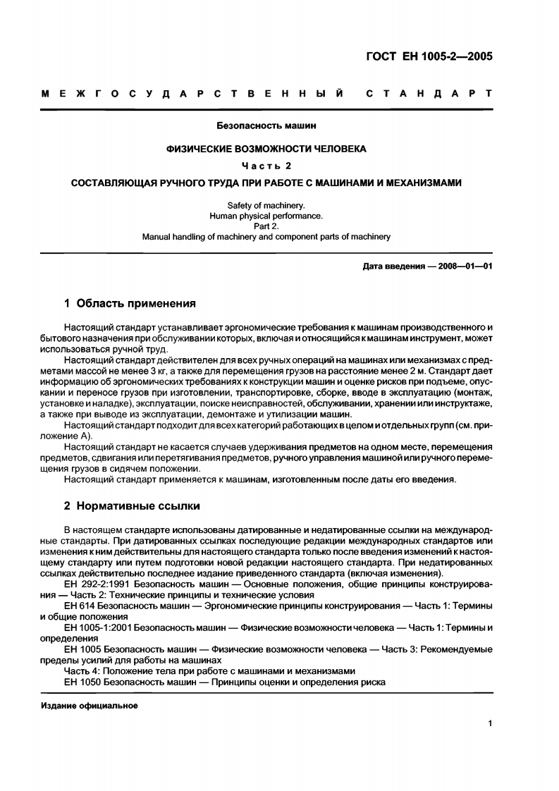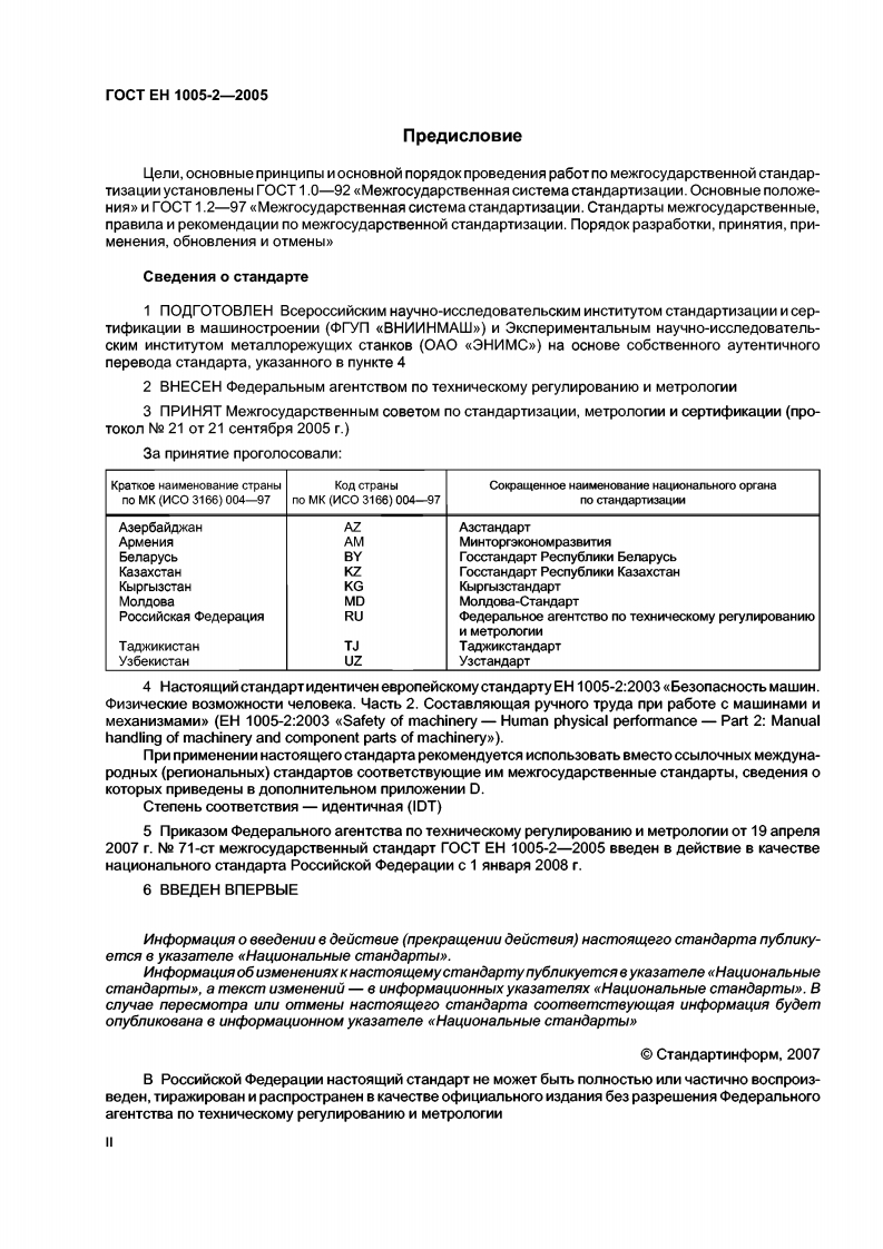 MEXKTOCYAPCTBEHHbIN COBET NO CTAHAAPTN3ALNN,METPONOTNN N CEPTNONKALNN(MrC)INTERSTATE COUNCIL FOR STANDARDIZATION,METROLOGY AND CERTIFICATION(Isc)TOCT EHMEK「OCyAPCTBEHHbIM1005-2一CTAHAAPT2005Be3onacHocTb MawNHPN3NYECKNE BO3MOXKHOCTN YENOBEKAHacTb 2COCTABNAKOLLAA Py4HOrO TPyANPN PABOTE C MAWMHAMM N MEXAHN3MAMNEH1005-2:2003Safety of machinery一Human physical performance-Part 2:Manual handling of machinery and component parts of machinery(DT可M3 naHne o中MuManbHoeMockBaCTaHAapTHH中opM2007
