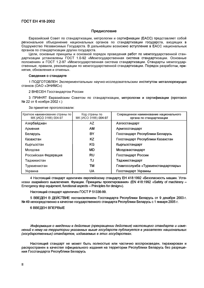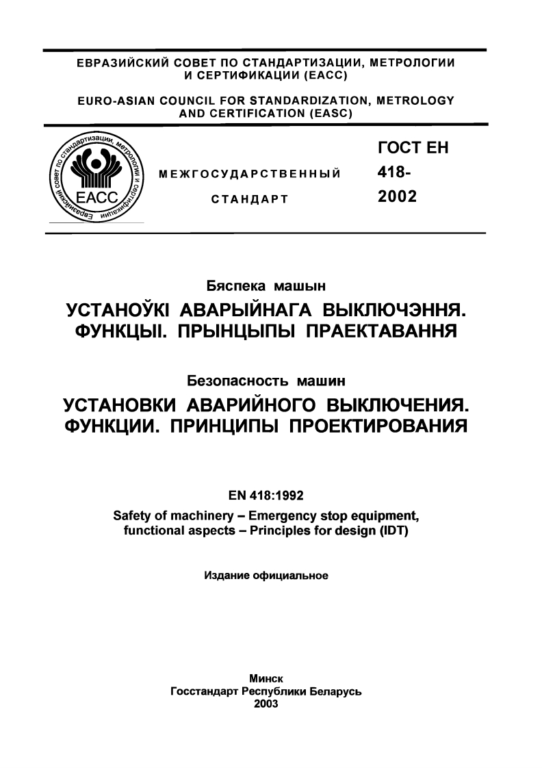 MEXKrOCYAPCTBEHHbIN CTAHDAPTTOCT EH 418-2002Be3onacHOCTb MaNHyCTAHOBKN ABAPNNHOrO BbIKNKOYEHNA.yHKUNN.nPNHUNnbI nPOEKTNPOBAHNASacneka MawbIHyCTAHOYKI ABAPbINHArA BbIKNOY3HHA.yHKUbII.nPbIHUbINbI nPAEKTABAHHA(EH418:1992,IDT)N3naHne oonunanbHoe8778098060MexkrocynapcTBeHHbIN coBeT noCTaHnapTn3aunn,MeTponornn NcepTn中MKa4MMMNHCK