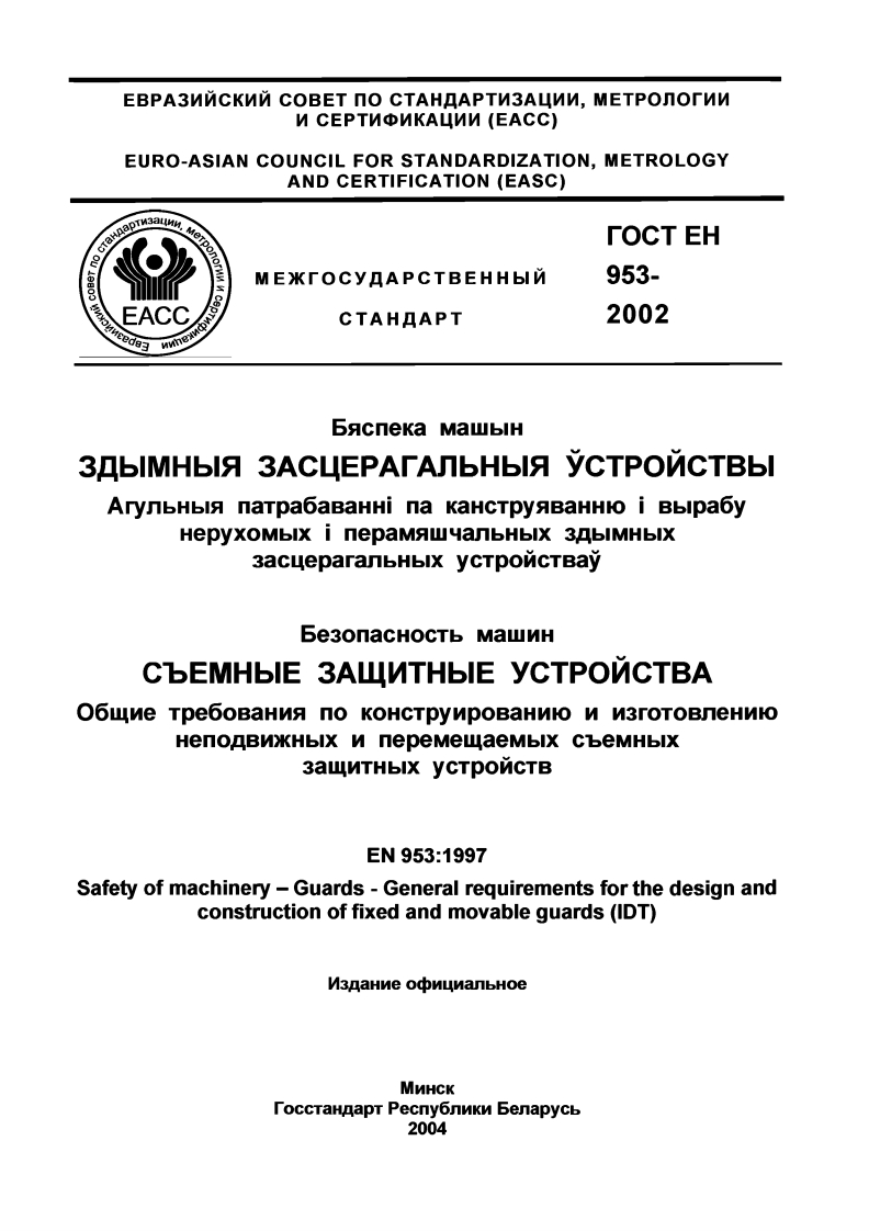 MEXKTOCYAPCTBEHHbIN CTAHAAPTT0CTEH953-2002Se3onacHOCTb MawNHCbEMHbIE 3ALNTHbIE yCTPONCTBAO6wne Tpe6oBaHnA no KOHCTpynpoBaHnIO n N3roToBneHNIOHenoBNXKHbIX n nepeMewaeMbIX CbeMHbIX3a山MTHbIX yCTPONCTBSAcneka MawbIH3AbIMHbIA 3ACUEPArANbHbIA yCTPONCTBbIArynbHbIA natpabaBaHHi na KaHcTpyABaHHIo i BblpaoyHepyXoMbIx i nepamawyanbHbIx 3bIMHbIX3acueparanbHbIx ycTponcTBay(EN953:1997,IDT)N3naHne oonunanbHoe82000超品MexkrocyAapcTBeHHbIn coBeT noG品CTaHAapTn3aunn,MeTponorn McepTn中MKa4MMMnHCK