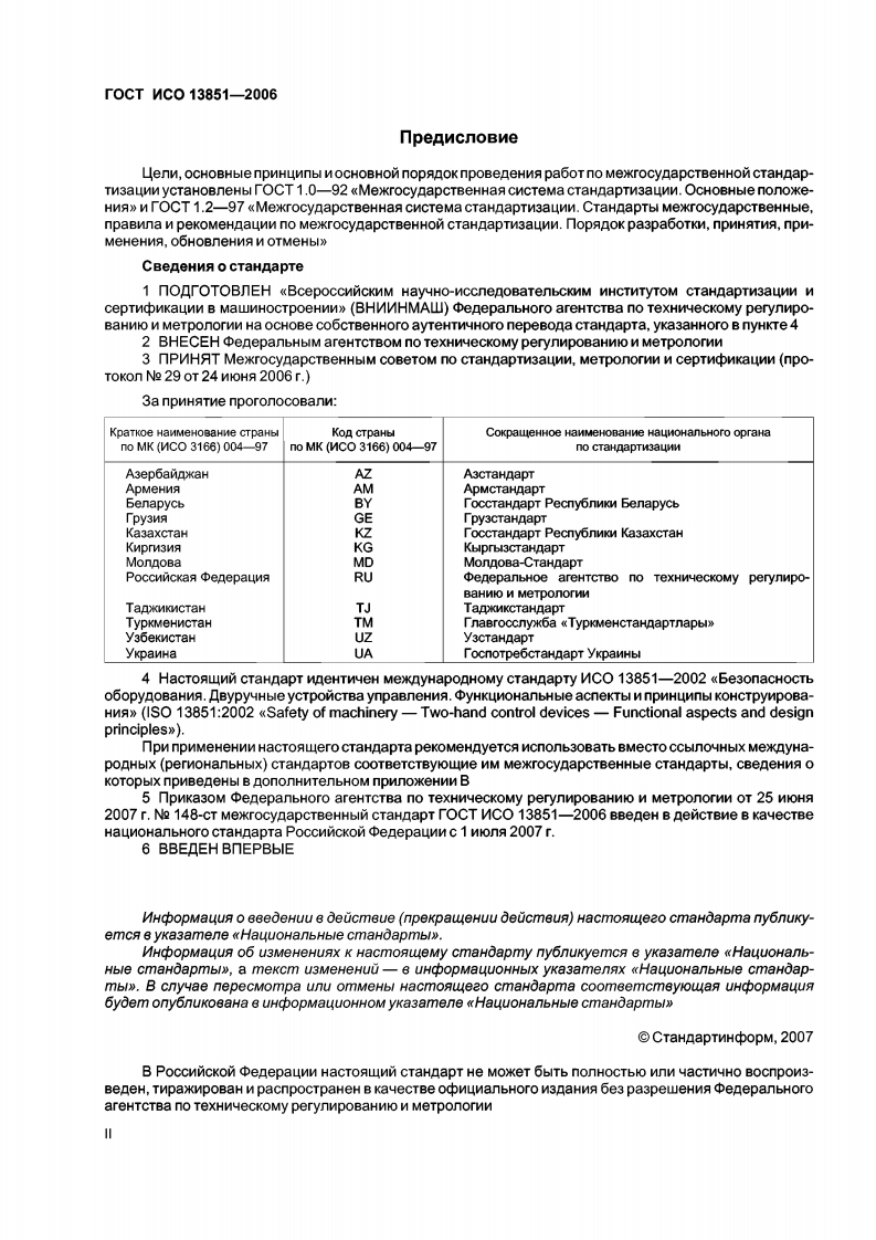 MEXKTOCYAAPCTBEHHbIN COBET nO CTAHAAPTN3AUNN,METPONOrNN M CEPTNONKAUNN(MrC)INTERSTATE COUNCIL FOR STANDARDIZATION,METROLOGY AND CERTIFICATION(ISC)rOCT WCOMEK「OCyAPCTBEHHbIM13851一CTAHAAPT2006Be3onacHocTb o6opyAoBaHnAByPyYHbIE yCTPONCTBA ynPABNEHNA.yHKUNOHANbHbIE ACnEKTbIW nPNHUNNbI KOHCTPyNPOBAHNA1S013851:2002Safety of machinery-Two-hand control devices-Functional aspectsand design principles(IDT)M3 QaHMe o中unanbHoe84000-5名MockBaCTaHAapTMHO中opM2007