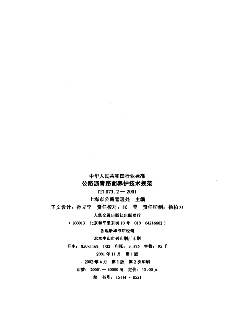 JTJ073.2-2001公路沥青路面养护技术规范348072@abc4个月前发布关注私信3.57MB122页020JTJ073.2-2001公路沥青路面养护技术规范此内容为付费资源,请付费后查看¥13¥23黄金会员免费钻石会员免费立即购买您当前未登录!建议登陆后购买,可保存购买订单付费资源 第1页 / 共122页 第2页 / 共122页 试读已结束,还剩120页,您可下载完整版后进行离线阅读 THE END标准规范 文本预览 中华人民共和国行业标准公路沥青路面养护技术规范Technical Specifications for Maintenance ofHighway Asphalt PavementJT073.2-2001主编部:上海市公路管理处批准部门:中华人民共和国交通部实施日期:2002年1月1H人武交通出汝士2001北:京 查看更多 收起部分 喜欢就支持一下吧收藏