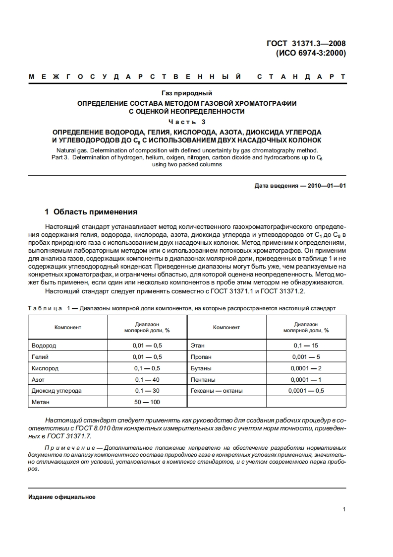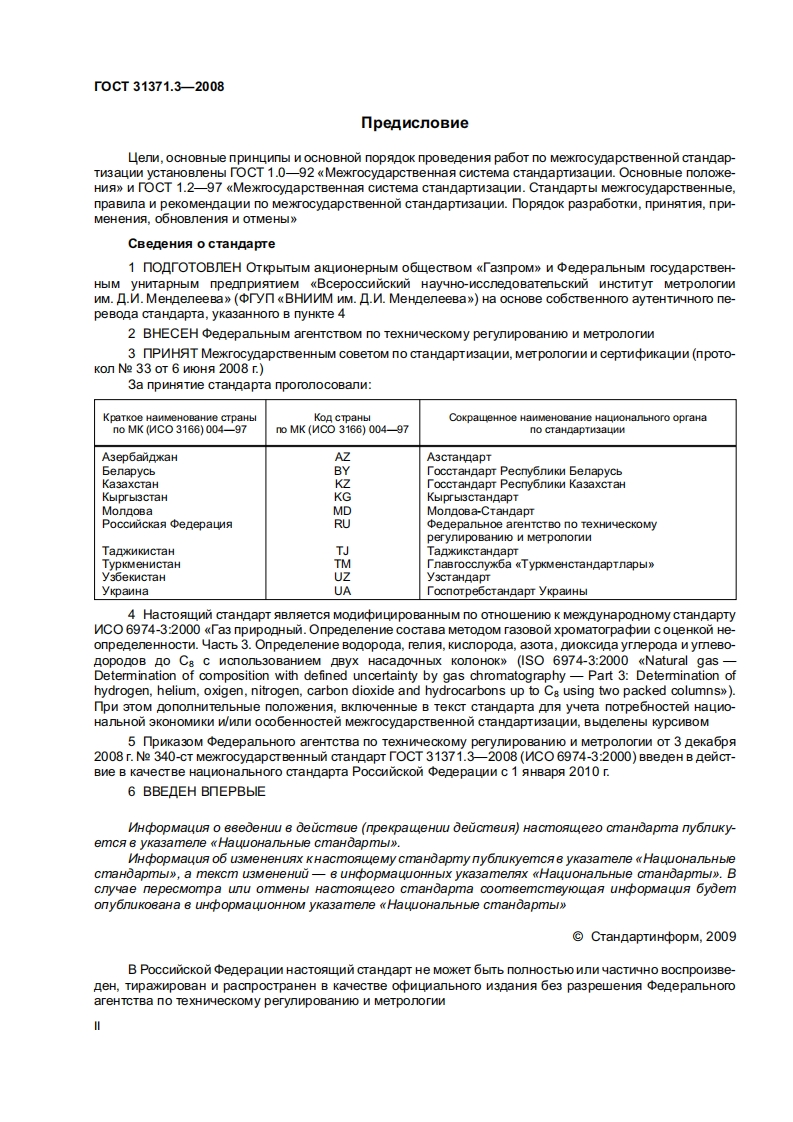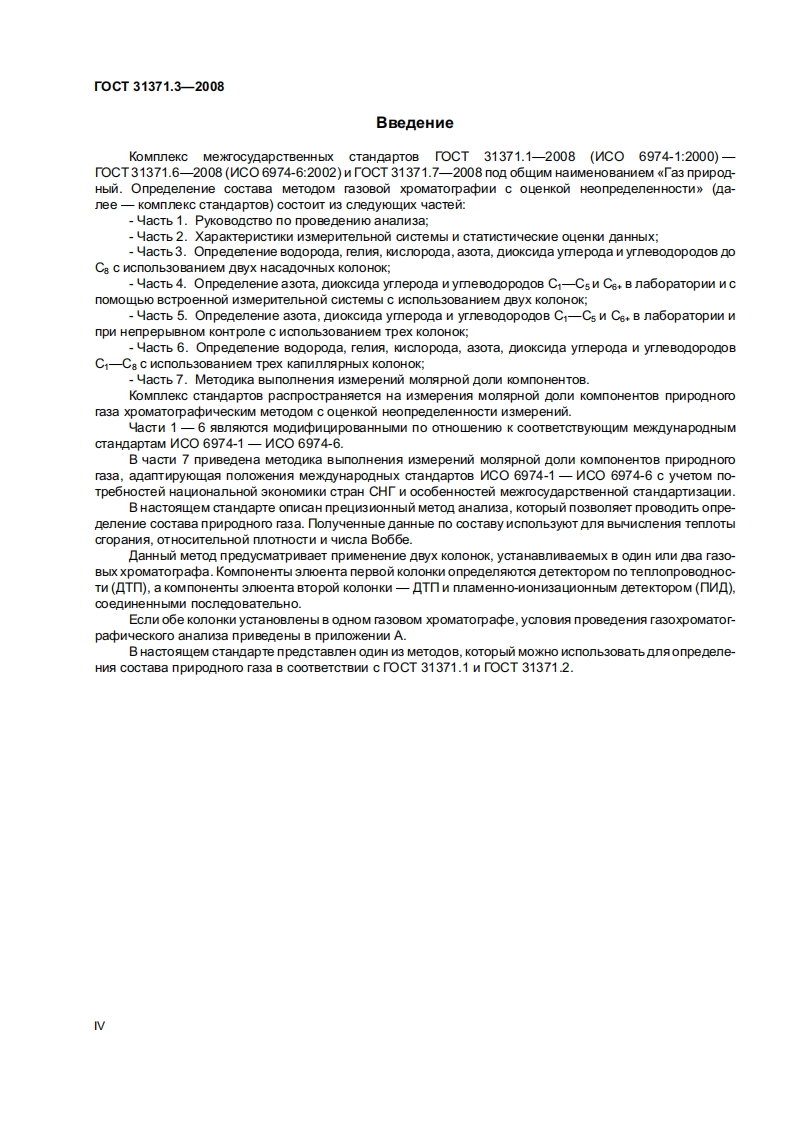 MEXKTOCYAPCTBEHHbIN COBET NO CTAHDAPTN3AUNM,METPOnOrMN N CEPTNONKAUNN(MrC)INTERSTATE COUNCIL FOR STANDARDIZATION,METROLOGY AND CERTIFICATIONǖsC)rocTMEK「OCyAPCTBEHHbIN31371.3-CTAHAAPT2008(MC06974-3:2000)「a3 npnponHbinOnPEAEEHNE COCTABA METOOM TA3OBONXPOMATOrPAONN C OLEHKONHEONPEAEEHHOCTNYacTb 3OnPENENEHNE BONOPONA.rENNA.KVCnOPOA,A3OTA,NOKCNA yrnEPOAW yrnEBOOPOOB O Ca C Ncnonb3OBAHNEMByX HACAOYHbIX KONOHOK1S06974-3:2000Natural gas-Determination of composition with defined uncertaintyby gas chromatography-Part 3:Determination of hydrogen,helium,oxigen,nitrogen,carbon dioxide and hydrocarbons up to Ca using two packed columns(MOD)M3 naHne o中nunanbHoe6927000008MocKBaCTaHAapTMH中opM2009