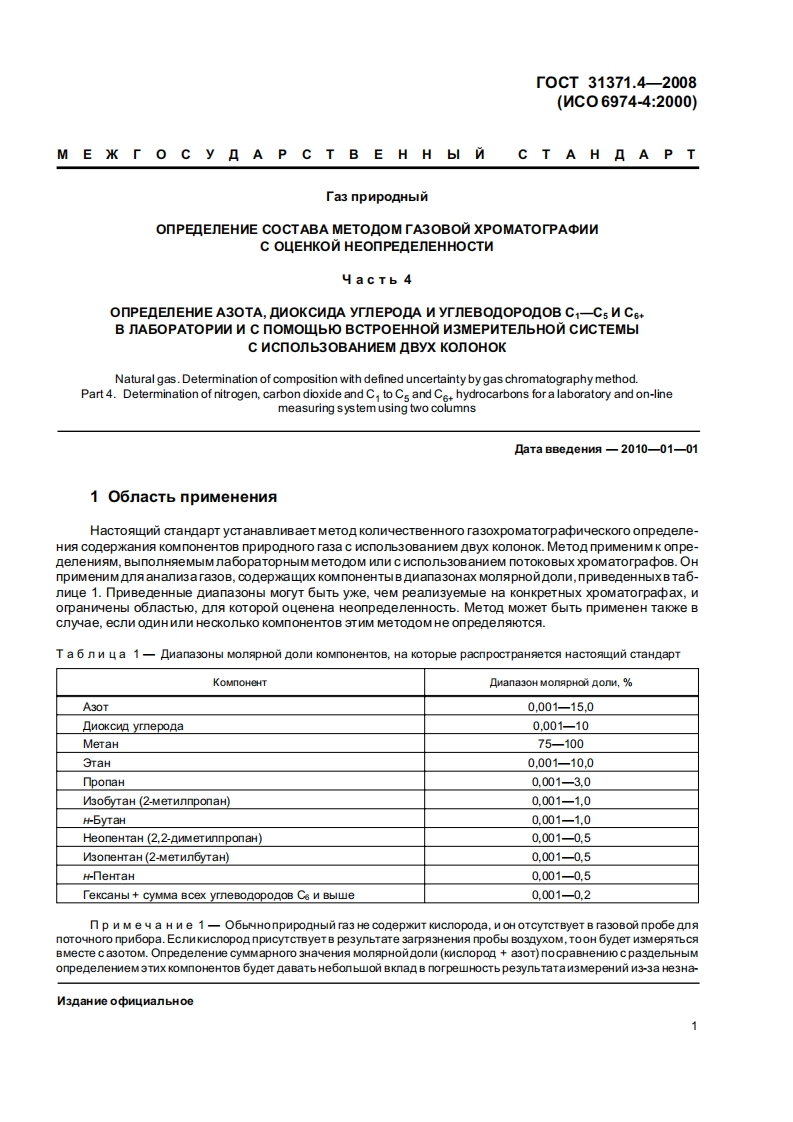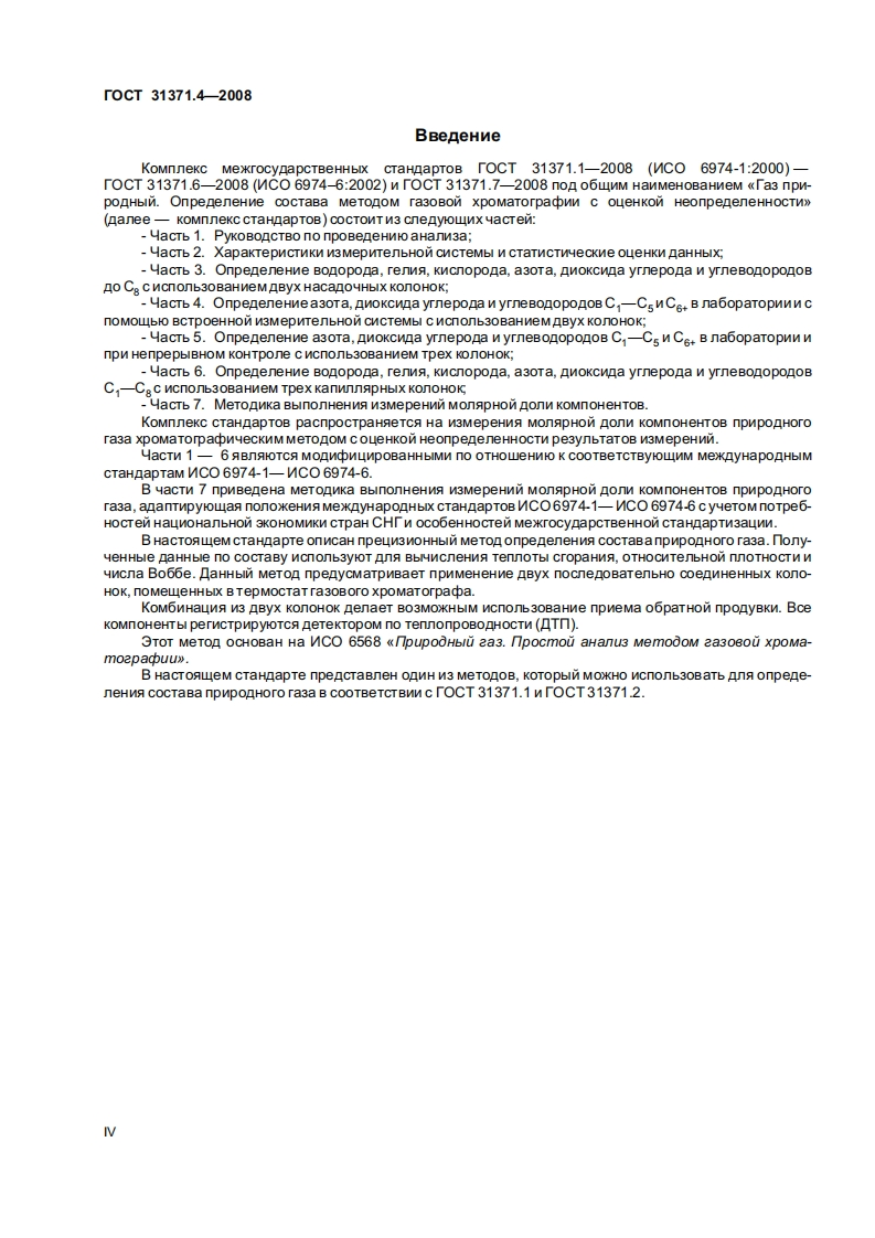 MEXKrOCyAPCTBEHHbIN COBET NO CTAHAAPTM3AUNN,METPOnOrNN W CEPTNONKAUMM(MrC)INTERSTATE COUNCIL FOR STANDARDIZATION,METROLOGY AND CERTIFICATION(ISC)rOCTMEK「OCyLAPCTBEHHbIN31371.4-CTAHAAPT2008(MC06974-4:2000)「a3 npnpoHbinONPENENEHME COCTABAMETONOM「A3 OBON XPOMATOrPAΦMMC OLEHKON HEONPEENEHHOCTNYacTb 4OnPEENEHNE A3OTA,NOKCNAA yrnEPOAW yrnEBOLOPOLOB C1-C5 W C6+B ABOPATOPNN N C NOMOLIbKOBCTPOEHHON N3MEPNTENbHON CNCTEMbIC Wcnonb3OBAHNEM ByX KOnOHOK1S06974-4:2000Natural gas-Determination of composition with defined uncertainty by gaschromatography-Part 4:Determination of nitrogen,carbon dioxide and Cto Cs and Ce+hydrocarbons for a laboratory and on-line measuring systemusing two columns(MOD)M3 QaHne o中MunanbHoe8MocKBaCTaHAapTWHφopM2009