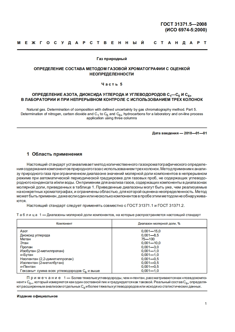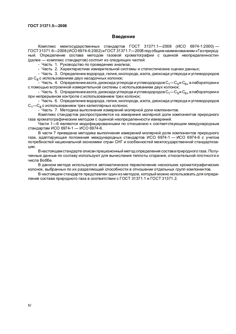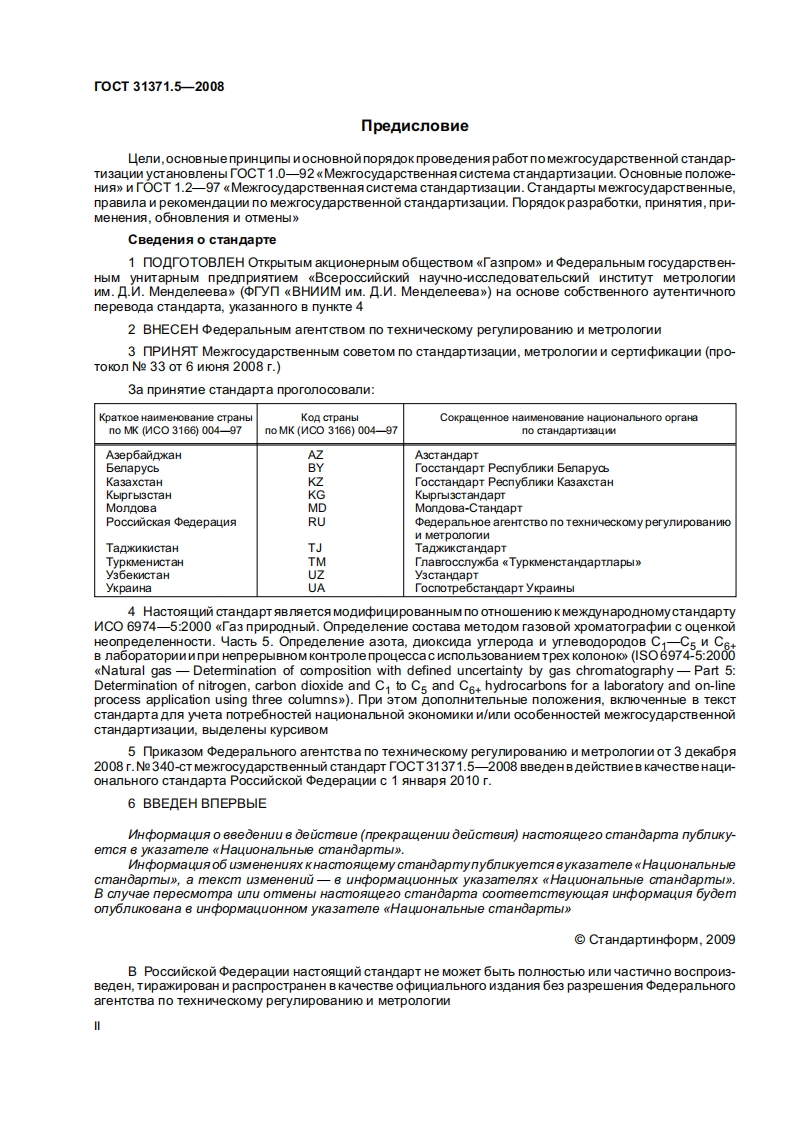 MEXKrOCYAPCTBEHHbIN COBET nO CTAHAAPTN3AUNN,METPONONN N CEPTNONKALNN(MrC)INTERSTATE COUNCIL FOR STANDARDIZATION,METROLOGY AND CERTIFICATION(Isc)rOCTMEK「OCyAPCTBEHHbIN31371.5-CTAHAAPT2008(MC06974-5:2000)「a3 npnponHbinOnPELENEHNE COCTABA METOOM TA3OBOMXPOMATOrPAONN C OLEHKONHEONPEENEHHOCTNYacTb 5OnPEDENEHNE A3OTA,ANOKCNAA yrEPOAW yrnEBOLOPOLOB C1-C5 W C6+B JABOPATOPNN N nPN HEnPEPbIBHOM KOHTPONEC Ncnonb3OBAHNEM TPEX KONOHOK1S06974-5:2000Natural gas-Determination of composition with defined uncertainty by gaschromatography-Part 5:Determination of nitrogen,carbon dioxide and C1 to C5and Ce+hydrocarbons for a laboratory and on-line process application using threecolumns(MOD)M3naHne oonunanbHoe8MocKBaCTaHnapTMHφopM2009