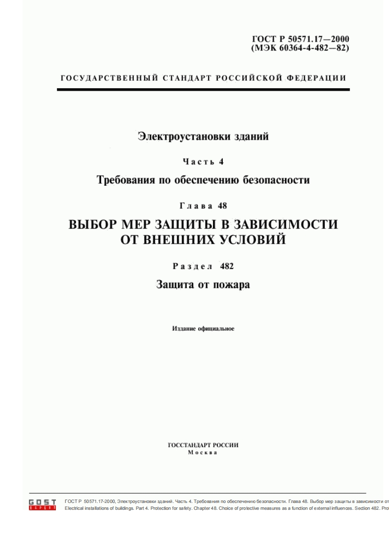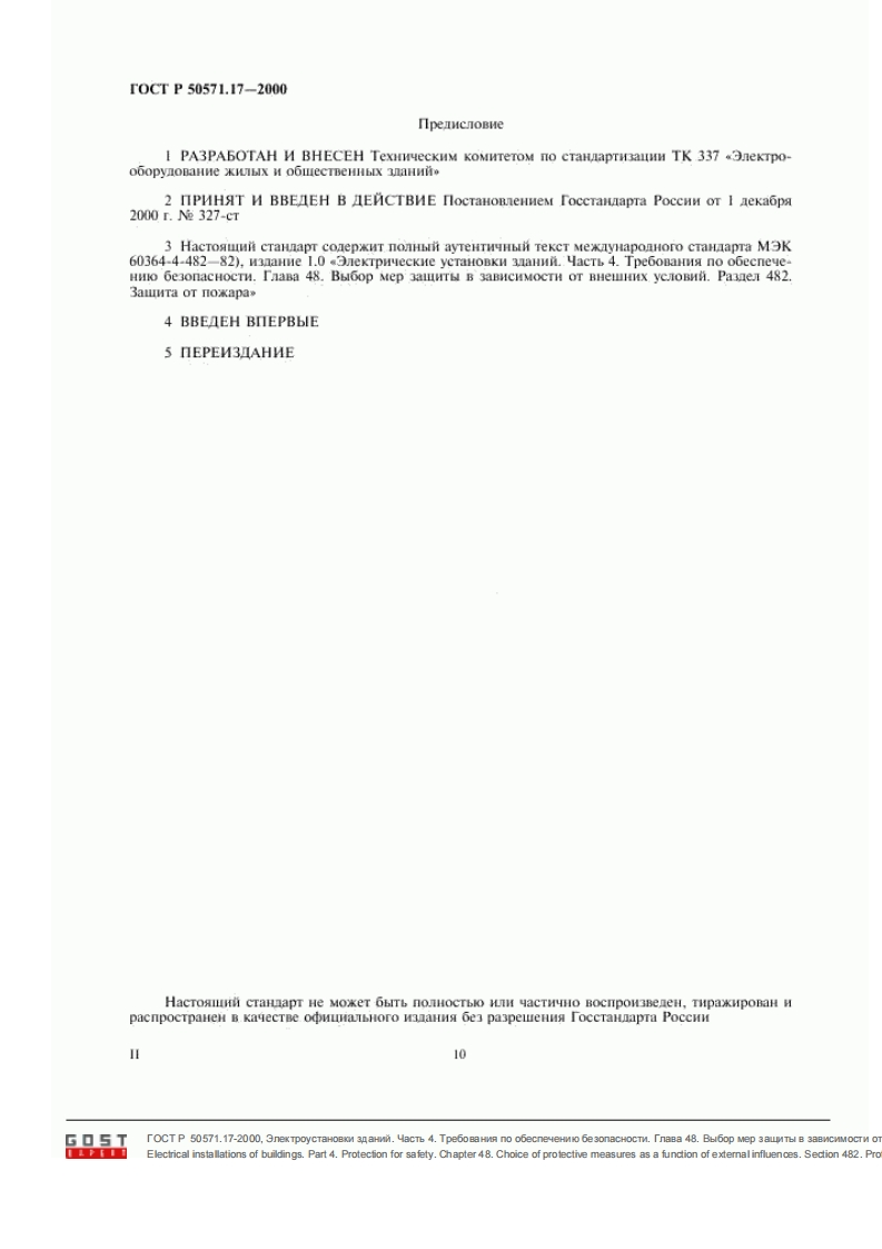 H A U MOH A JI b H bI E C T A H IA P T bIOJIEKTPOYCTAHOBKN 3AHIMTpe6oBaHna no o6ecneyeHno be3onacHocTny a cTb 2M3 naHne o中HUHanbHoeM0c第#aHnK M3ATEIbCTBO CTAHAPTOB2004G▣5TTOCT P 50571.17-2000,3nexTpoyCTaHOBKM 3naHMA.HacTb 4.Tpe6oBaHMR no o6ecneNeHno 6e 3onaCHOCTM.TnaBa 48.Bbl6op Mep 3aLTbl B 3aBNCMMOCTM OTElectrical installations of buildings.Part 4.Protecfion for safety.Chapter 48.Choice of protective measures as a function of extemnal influences.Section 482.Pre