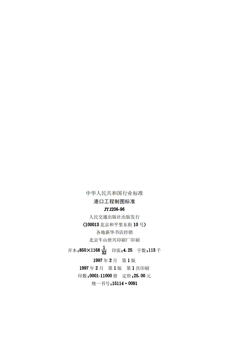 JTJ206-96港口工程制图标准348072@abc4个月前发布关注私信4.10MB134页042JTJ206-96港口工程制图标准此内容为付费资源,请付费后查看¥13¥23黄金会员免费钻石会员免费立即购买您当前未登录!建议登陆后购买,可保存购买订单付费资源 第1页 / 共134页 第2页 / 共134页 试读已结束,还剩132页,您可下载完整版后进行离线阅读 THE END标准规范 文本预览 中华人民共和国行业标准港口工程制图标准JTJ206-96。河海大学主编单位:中交水运规划设计院批准部门:中华人民共和国交通部施行日期:1997年5月1日人民交通出版社1996·北京 查看更多 收起部分 喜欢就支持一下吧收藏