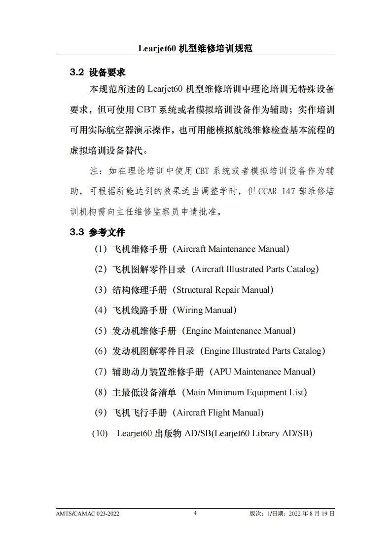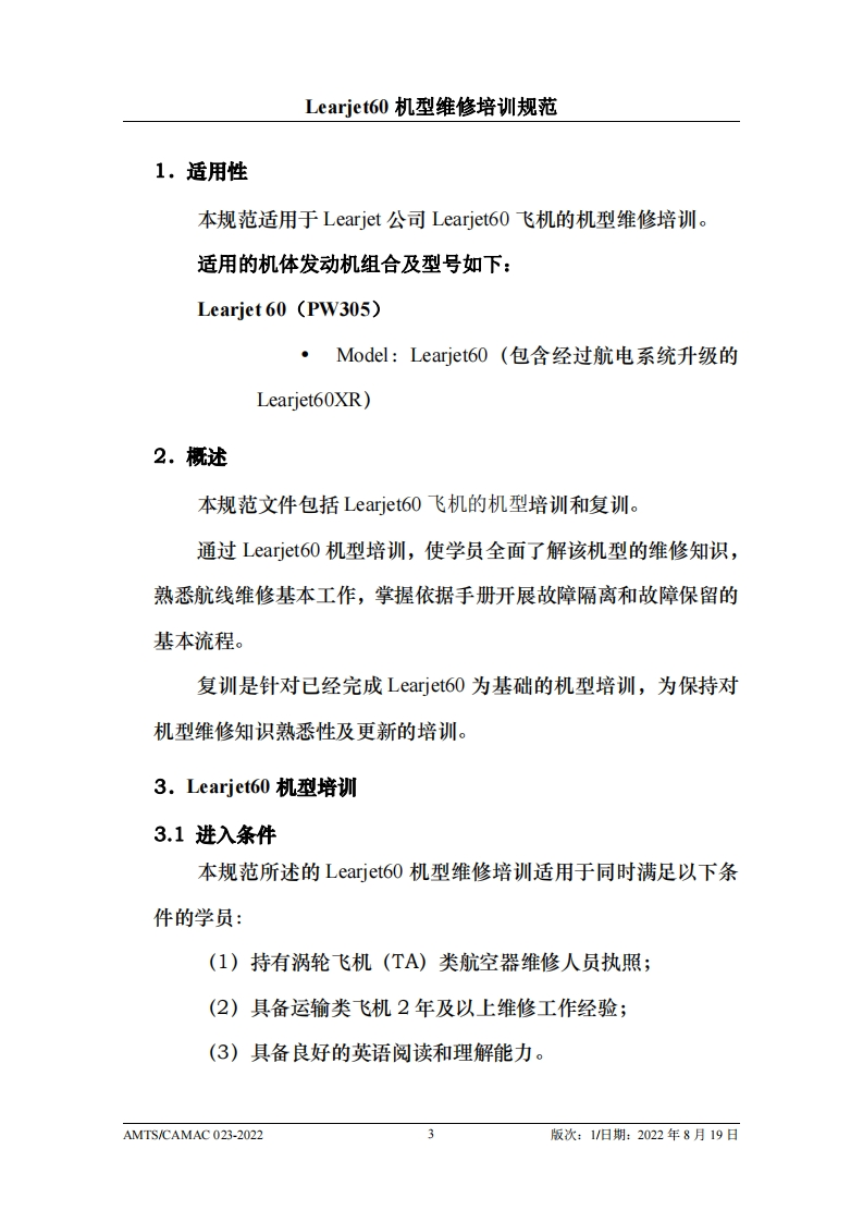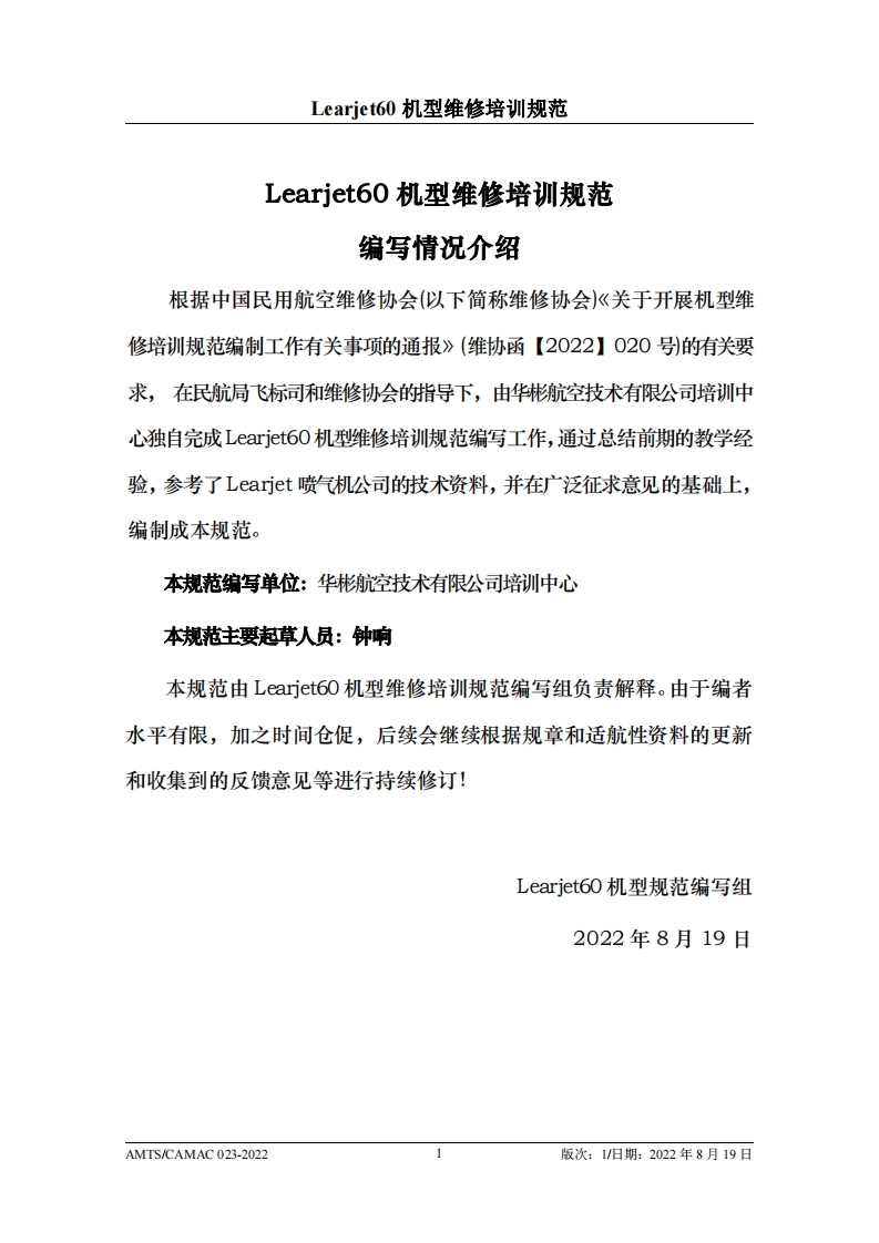 CAH光中国民用航空维修协会Learjete60机型维修培训规范AMTS/CAMAC 023-2022第1版/2022年8月19日本文件由中国民用航空维修协会民航维修培训机构工作委员会(CCAR-147委员会)编制,并经中国民用航空局航空器评审组(AEG)的认可。航空运营人、维修单位或维修培训机构在开展机型维修培训时可参考本文件制定相应的机型维修培训教学大纲。本文件将根据Learjet60机型的设计更改和使用反馈进行修订,请上述相关方予以及时关注,以评估对所编制教学大纲的影响。