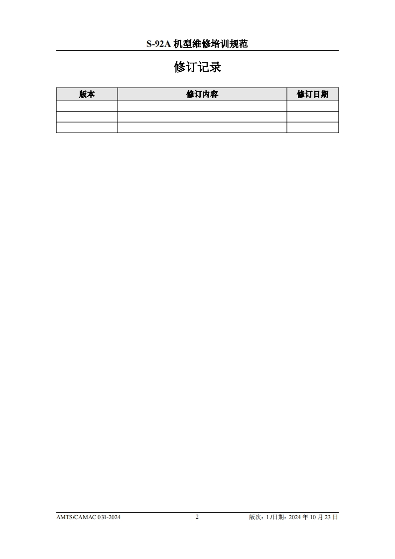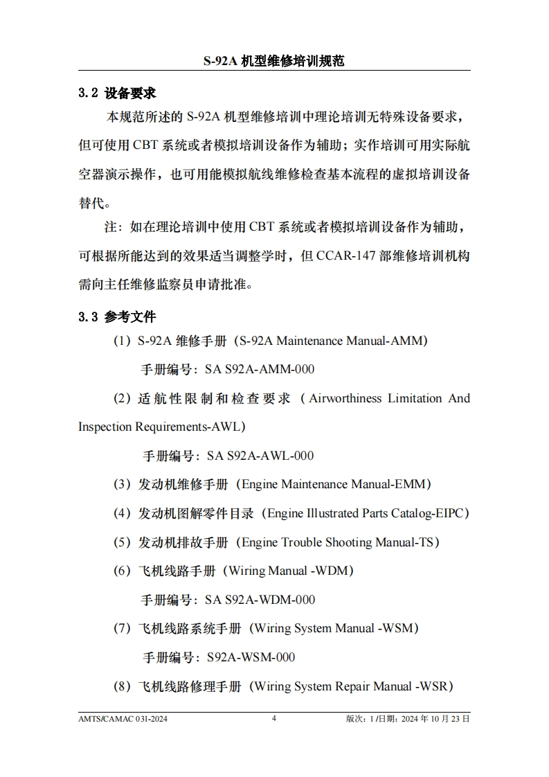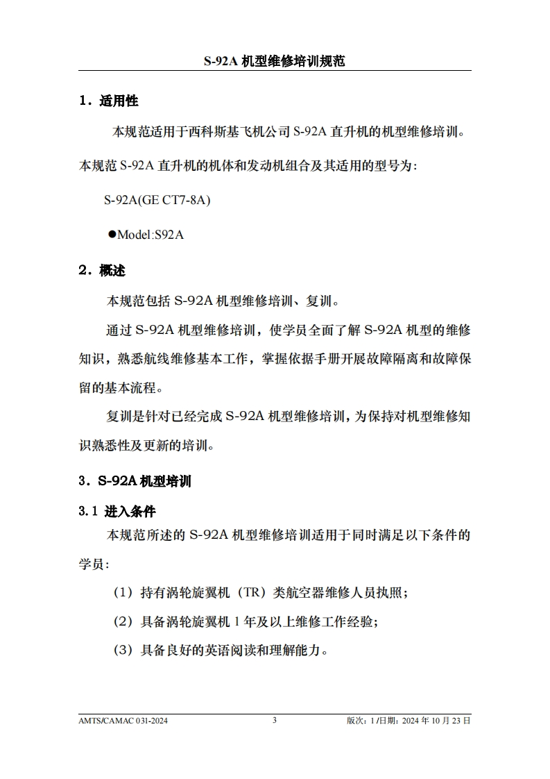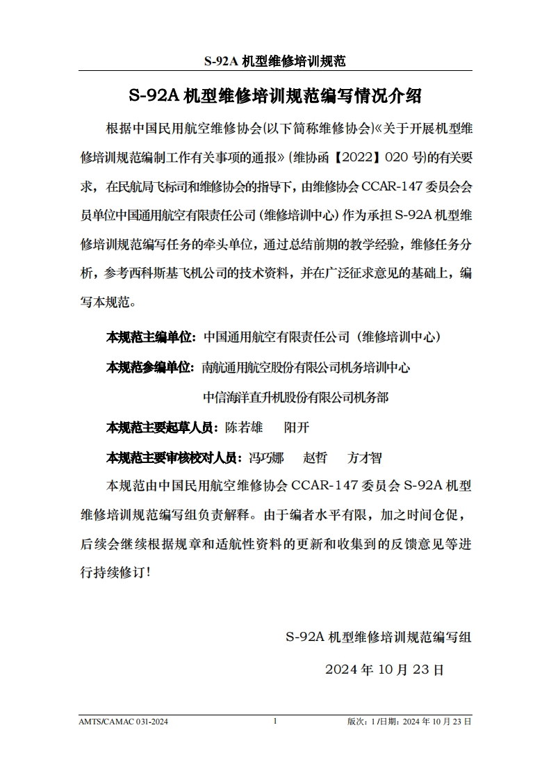 CAH光中国民用航空维修协会S-92A机型维修培训规范AMTS/CAMAC 031-2024第1版/2024年10月23日本文件由中国民用航空维修协会民航维修培训机构工作委员会(CCAR-147委员会)编制,并经中国民用航空局航空器评审组(AEG)的认可。航空运营人、维修单位或维修培训机构在开展机型维修培训时可参考本文件制定相应的机型维修培训教学大纲。本文件将根据S-92A机型的设计更改和使用反馈进行修订,请上述相关方予以及时关注,以评估对所编制教学大纲的影响。