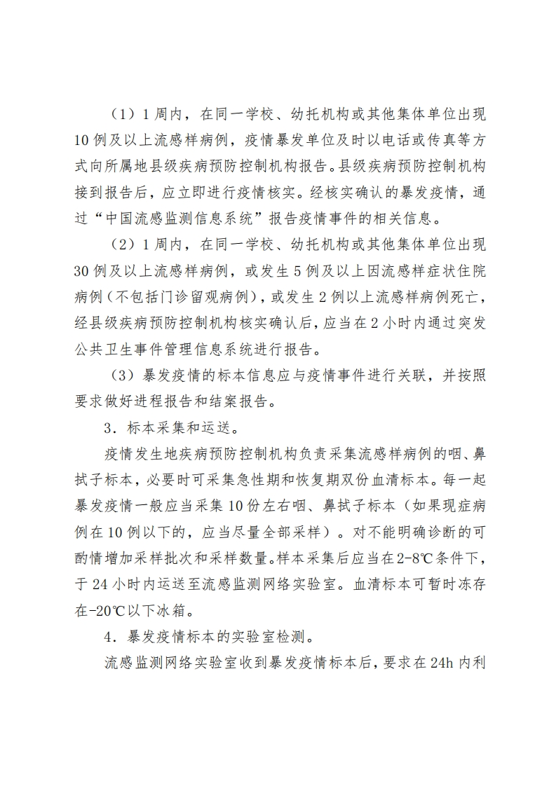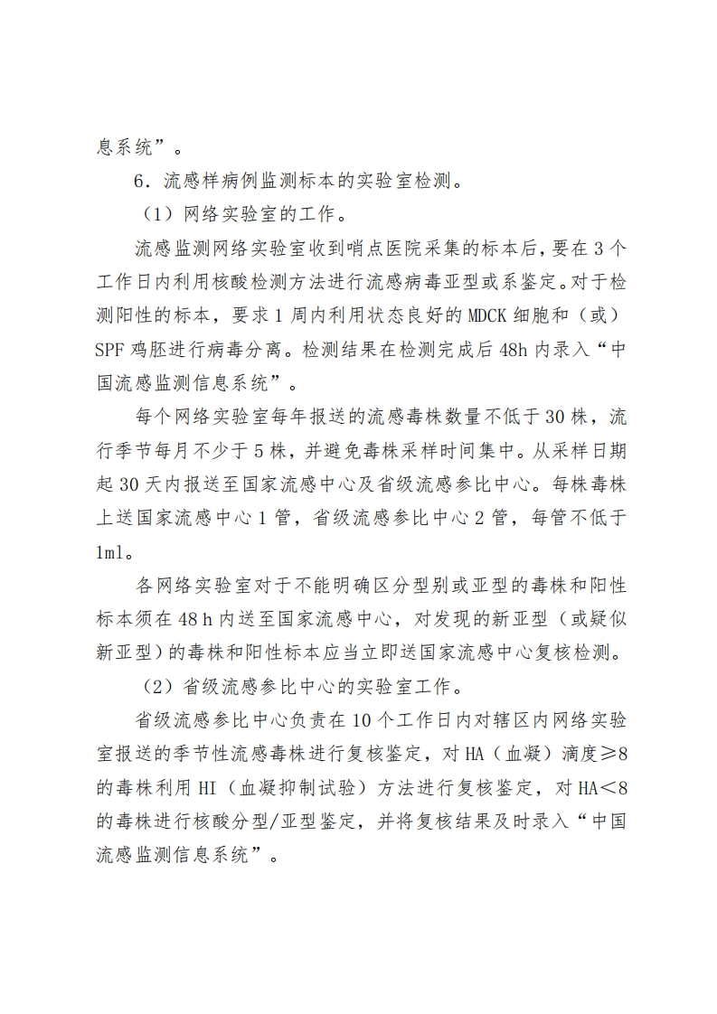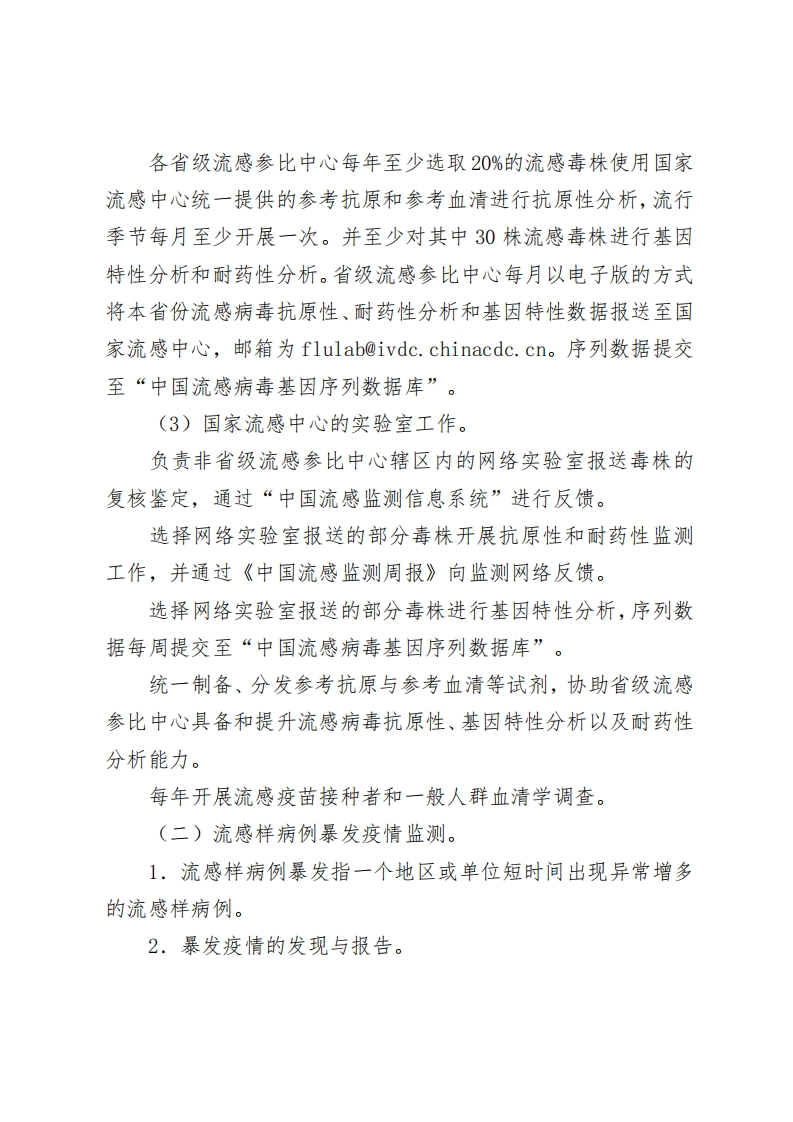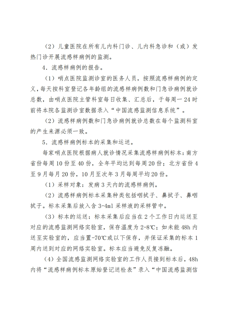 全国流感监测方案(2017年版)为进一步规范、有序开展流感监测工作,全面提高流感监测工作质量和水平,加强省级流感参比中心能力建设,为流感防控工作提供科学依据,特制定本方案。一、监测目的(一)实时监测流感活动水平和流行趋势;(二)实时追踪流感病毒变异,及时发现新型流感病毒,并做出预警;(三)为全球及我国流感疫苗株的推荐及抗病毒药物的使用提供依据;(四)为流感大流行的准备和应对提供技术支撑。二、监测内容与工作要求(一)流感样病例监测。1.监测对象。流感样病例,即发热(体温≥38℃),伴咳嗽或咽痛之一者。2.监测时间。所有国家级流感样病例监测哨点医院和流感监测网络实验室均全年开展流感样病例监测。3.监测诊室的设置。(1)综合医院在所有内科门诊、内科急诊、发热门诊和(或)儿内科门诊、儿内科急诊开展流感样病例的监测。
