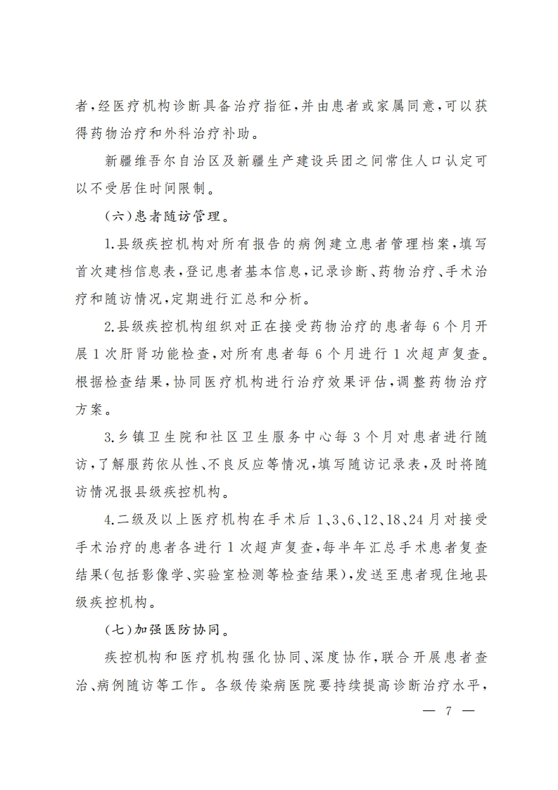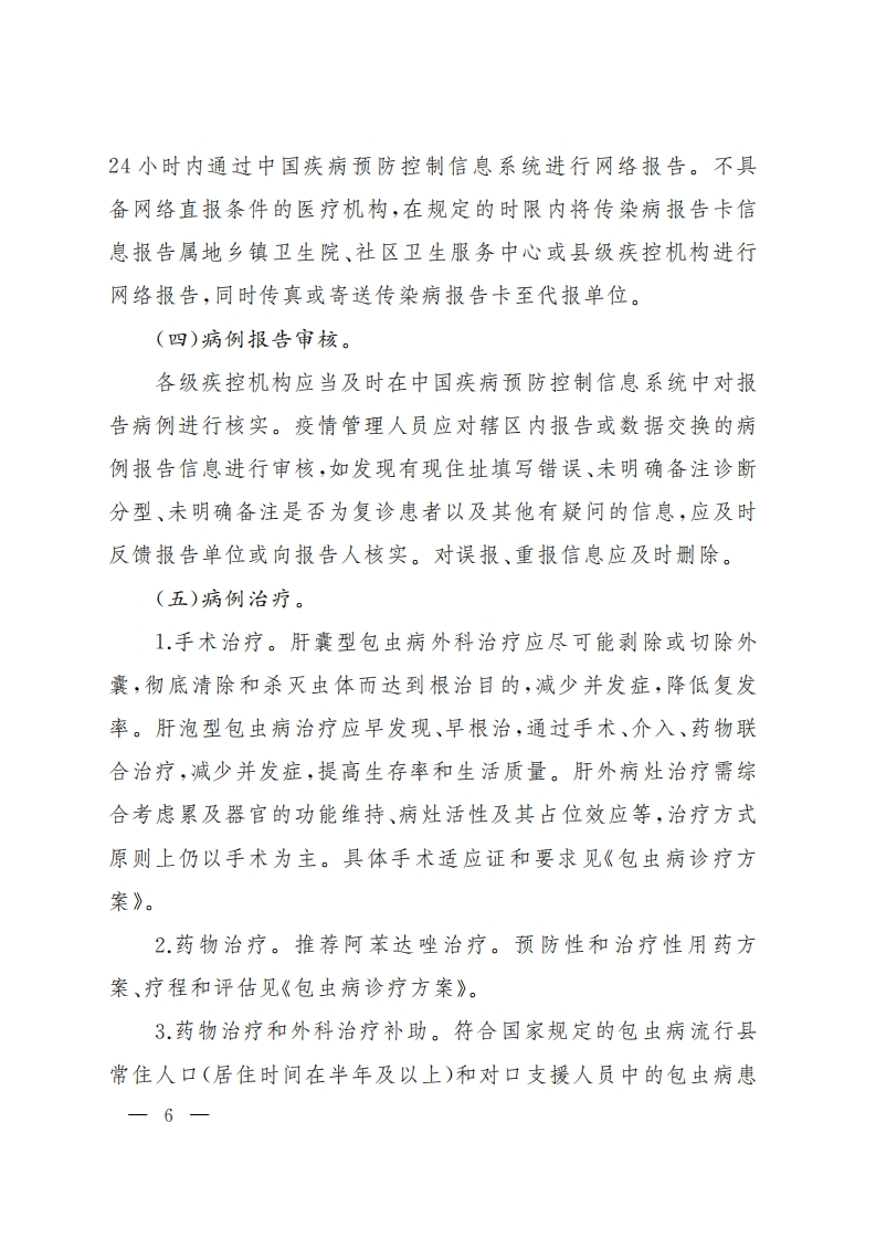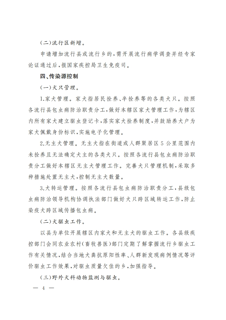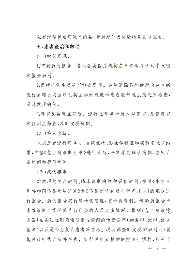 包虫病防治技术方案(2025年版)为保障《“健康中国2030”规划纲要》和《全国包虫病等重点寄生虫病综合防治实施方案(2024一2030年)》目标的实现,科学规范开展包虫病防治工作,根据《中华人民共和国传染病防治法》有关要求,特制定本方案。一、防治策略包虫病流行区采取“以传染源控制为主、中间宿主防控与病人规范查治相结合”的综合防治策略。二、流行县防治阶段各流行县(市、区、旗,以下统称县)落实各项防治策略和措施,逐步实现各阶段控制指标要求。依据儿童包虫病患病率、新增病例、新增儿童病例情况,犬棘球绦虫感染率,牲畜包虫病患病率,啮齿类动物包虫病患病率,结合包虫病防治的档案资料及连续达到相应要求年数,将包虫病流行县防治阶段分为未达疫情控制、疫情控制、传播控制、传播阻断和消除共5个阶段。三、防治阶段调整及流行区新增(一)流行县防治阶段调整。按《全国包虫病等重点寄生虫病综合防治实施方案(2024一2030年)》疫情控制、传播控制、传播阻断、消除指标要求,阶段性评价后适时调整。—3