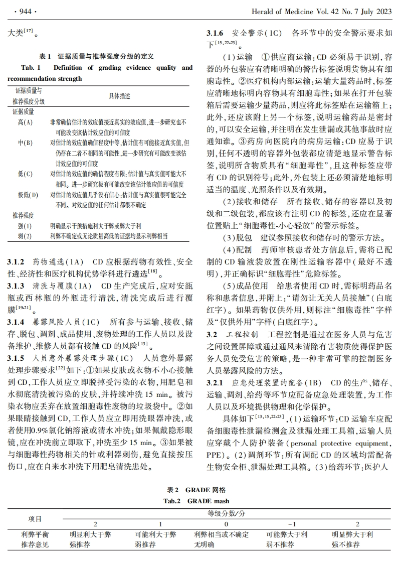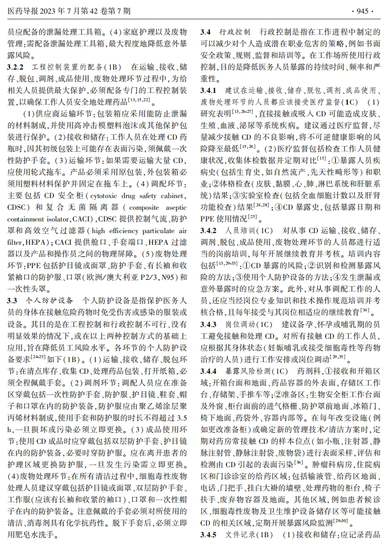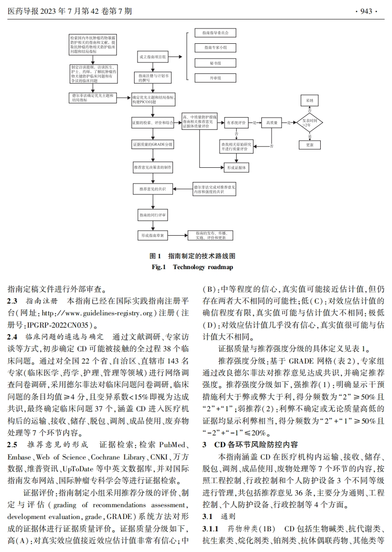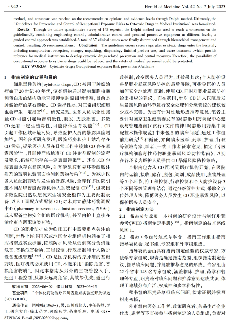 医药导报2023年7月第42卷第7期·941··规范、指南、共识·编者按细胞毒性药物是一类通过影响细胞核酸和蛋白质结构功能直接抑制肿瘤细胞增殖的药物,目前是治疗肿瘤的基石药物。细胞毒性药物选择性差,对正常组织细胞也有一定的毒性。在我国,许多医疗机构由于医务人员对细胞毒性药物防护意识不足,存在细胞毒性药物职业暴露风险。因此,加强细胞毒性药物职业暴露防护管理显得极为重要。基于此,由中华医学会临床药学分会、中国药学会药物流行病学专业委员会、四川省药学会药物流行病学专业委员会、四川省药理学学会治疗药物监测研究专业委员会牵头,于2021年11月26日在线上召开医疗机构细胞毒性药物职业暴露风险防控指南研讨会并正式启动指南撰写项目,该会议确定了指南工作组成员,并对指南大纲及研究方案进行了研讨。2022年4月9日,线上召开第六届天府药学学术会议一细胞毒性药物职业暴露风险防控指南指导委员会会议,指导委员会成员对指南临床问题进行了严格把关。2022年6月1日,线上召开医疗机构细胞毒性药物职业暴露风险防控指南制定专家组会议,会后专家组成员对指南临床问题进行了首轮专家调查问卷。经过指南秘书组检索及整合证据,完成指南推荐意见。2023年2月9日进行了第二次专家调查问卷,根据专家意见修改推荐意见并形成指南初稿。2023年4月2日召开的第七届天府药学论坛之医疗机构细胞毒性药物职业暴露风险防控指南审定会议,对指南初稿内容进行逐条修订。经过多次修订,中华医学会临床药学分会在2023年5月27日于成都召开的2023年全国学术会议上正式发布了本指南。本指南由四川省医学科学院·四川省人民医院及个体化药物治疗四川省重点实验室牵头制定,在172名专家共同努力下完成编写,旨在为各医疗机构从事细胞毒性药物相关的工作人员提供职业暴露风险防护的指导和建议,以提高我国细胞毒性药物职业暴露防护水平。医疗机构细胞毒性药物职业暴露风险防控指南*四川省医学科学院·四川省人民医院;个体化药物治疗四川省重点实验室:电子科技大学医学院摘要目的为医疗机构提供细胞毒性药物职业暴露风险防控策略,提高医务人员防护意识,降低医务人员发生潜在的职业暴露风险。方法采用世界卫生组织(WHO)指南制定手册进行细胞毒性药物职业暴露风险分级管控防护指南的研究设计。通过系统检索,指南编写组广泛收集细胞毒性药物进入医院后调配、使用等各环节存在的暴露风险问题,采用德尔菲法调研专家并确定临床问题,采用文献调研、专家经验法整理形成相关证据体后,按照推荐分级的评价、制定与评估(GRADE)方法进行质量评价,并再次通过德尔菲法对推荐意见及证据级别达成共识,最终形成《医疗机构细胞毒性药物职业暴露风险防护指南》。结果通过对43位专家进行网络调查问卷调研,采用德尔菲法对指南达成共识,将工程控制、行政控制和个人防护设备3个不同等级相结合,通过分级管控方式,最终确定37个临床问题,共形成36条推荐意见。结论该指南内容酒盖运输、接收、储存、脱包、调剂、成品使用、废物处理等7个环节,可为医疗机构制定细胞毒性药物相关防控措施提供参考与补充降低医务人员发生细胞毒性药物职业暴露的可能性,保护医务人员安全。关键词细胞毒性药物:职业暴露:风险防控:指南▣8▣中图分类号R5文献标识码A文章编号1004-0781(2023)07-0941-012D0I10.3870/j.issn.1004-0781.2023.07.001开放科学(资源服务)标识码(OSD)》Guidelines for Prevention and Control of Occupational Exposure Risks to CytotoxicDrugs in Medical Institution(Sichuan Academy of Medical Sciences,Sichuan Provincial People's Hospital;Personalized Drug Therapy KeyLaboratory of Sichuan Province;School of Medicine,University of Electronic Science and Technology of China)ABSTRACT Objective To provide medical institutions with occupational exposure risk prevention and control strategiesfor cytotoxic drugs.Enhance the protective awareness of medical personnel and reduce potential occupational exposure risks.Methods The World Health Organization (WHO)guideline formulation manual was used to study and design the guidelines forthe hierarchical control and protection of occupational exposure to cytotoxic drugs.Guide writing group collect exposure riskproblems in various links such as the allocation and use of cytotoxic drugs after entering the hospital retrieval through systematicretrieval.The Delphi method was used to construct identify clinical issues,and evidence-based research methods were used todevelop relevant evidences.The Delphi method was used to survey experts and identify clinical issues.Literature research andexpert experience methods were utilized to compile relevant evidences.Quality evaluation was conducted using the GRADE