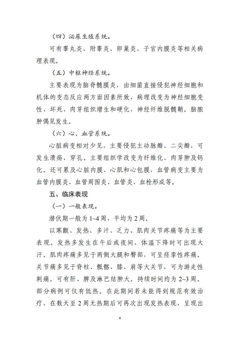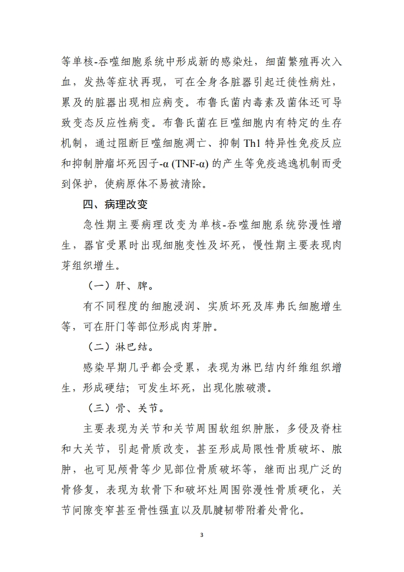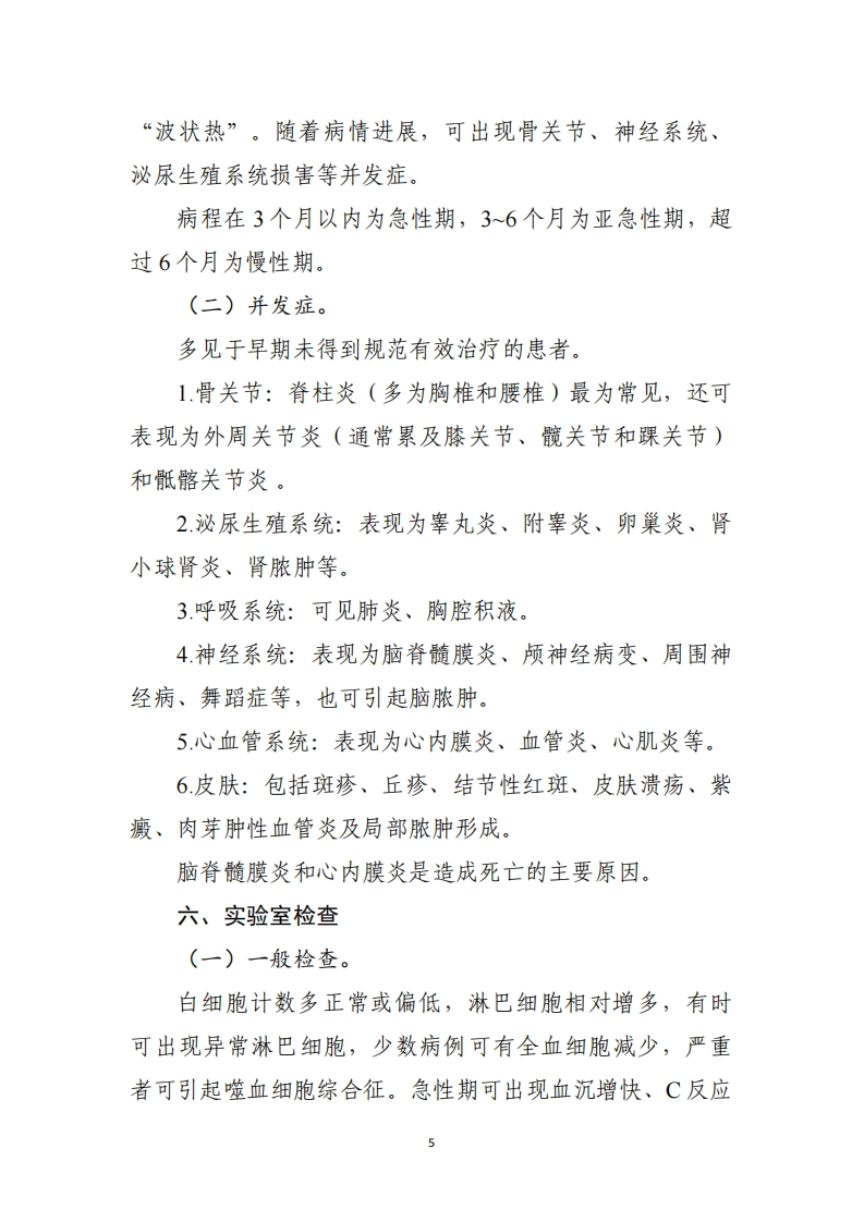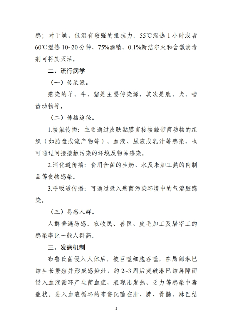 附件8布鲁氏菌病诊疗方案(2023年版)布鲁氏菌病(Brucellosis,简称布病)又称“波状热”,是由布鲁氏菌(Brucella)感染引起的人畜共患传染病,我国主要在北方地区流行,近年来南方地区的流行强度亦有所增加,局部地区时有疫情发生。布鲁氏菌病为《中华人民共和国传染病防治法》规定的乙类传染病。为进一步规范临床诊治工作,在2012年原卫生部印发的《布鲁氏菌病诊疗指南(试行)》基础上,结合国内外研究进展和诊疗经验,制定本诊疗方案。一、病原学布鲁氏菌属是一组微小的球状、球杆状、短杆状细菌,共有12个种,包括羊种、牛种、猪种、犬种、沙林鼠种、绵羊附睾种、鲸种、鳍种、田鼠种、人源种和赤狐种。其中羊种、牛种、猪种和犬种布鲁氏菌可造成人感染。电镜下羊种布鲁氏菌为明显的球形,大小约为0.3~0.6μm,牛种和猪种布鲁氏菌多呈短杆状或球杆状,大小约为0.62.5um。布鲁氏菌没有鞭毛,不形成芽胞和荚膜。布鲁氏菌形态易受外界环境因素的影响而发生改变,呈现多态性,细胞壁可增厚,也可变薄,或者脱落。布鲁氏菌对湿热、紫外线、常用的消毒剂等比较敏
