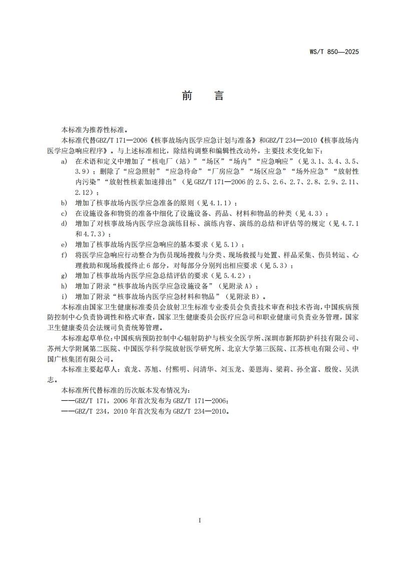 核事故场内医学应急准备与响应标准Standardofon-sitemedicalpreparednessandresponsefornuclearemergency348072@abc14天前发布关注私信0.32MB13页030核事故场内医学应急准备与响应标准Standardofon-sitemedicalpreparednessandresponsefornuclearemergency此内容为付费资源,请付费后查看¥49¥69黄金会员免费钻石会员免费立即购买您当前未登录!建议登陆后购买,可保存购买订单付费资源 第1页 / 共13页 第2页 / 共13页 第3页 / 共13页 第4页 / 共13页 第5页 / 共13页 试读已结束,还剩8页,您可下载完整版后进行离线阅读 THE END标准规范 文本预览 ICS13.280CCS C 57WS中华人民共和国卫生行业标准WS/T850-2025代替GBZ/T171一2006,GBZ/T234一2010核事故场内医学应急准备与响应标准Standard of on-site medical preparedness and response for nuclear emergencyXXXx-X-XX发布XXXX-Xx-XX实施中华人民共和国国家卫生健康委员会发布 查看更多 收起部分 喜欢就支持一下吧收藏