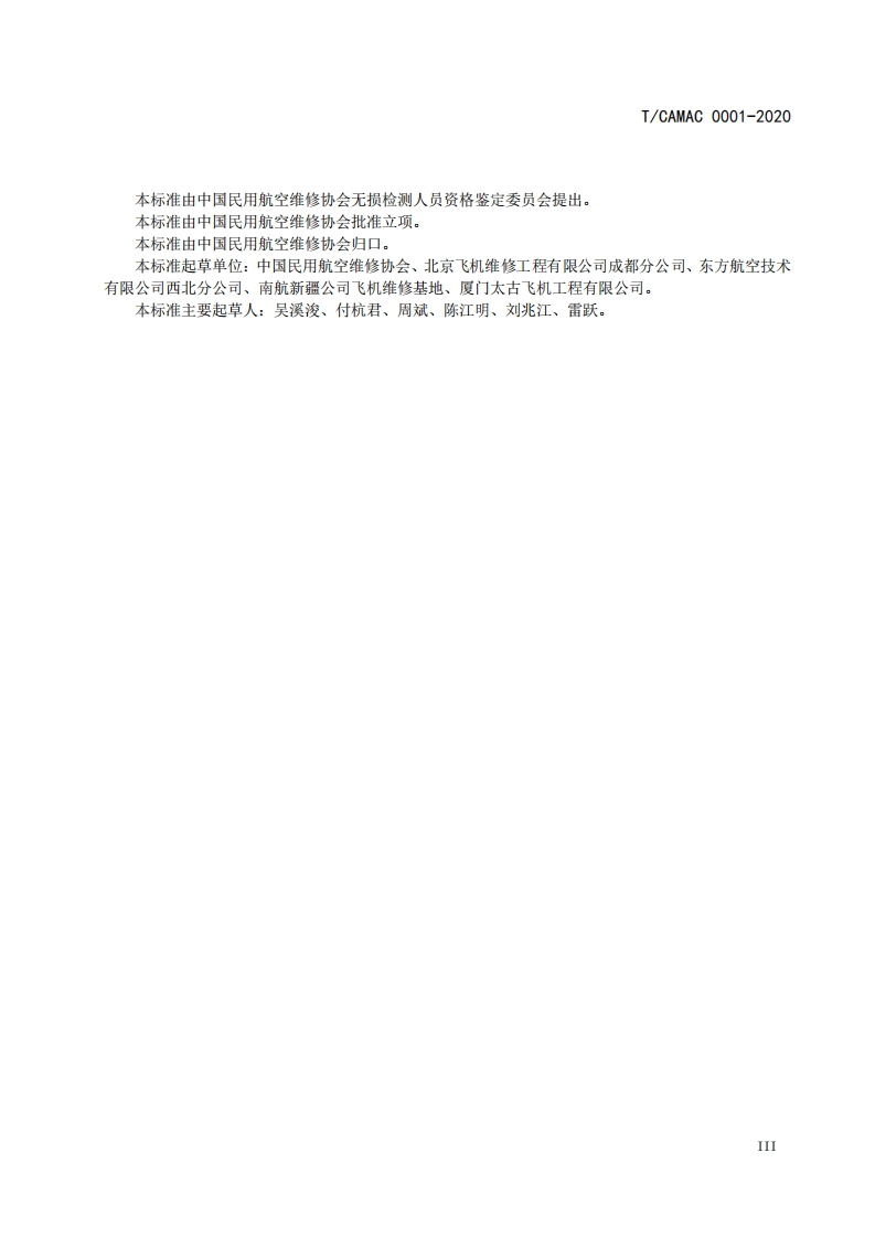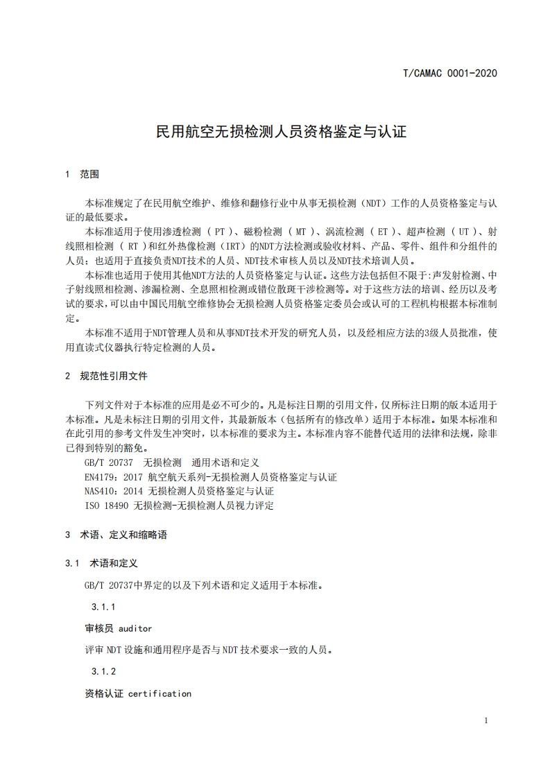 民用航空无损检测人员资格鉴定与认证QualificationandCertificationofNondestructiveTestingPersonnelofCivilAviation348072@abc14天前发布关注私信0.44MB23页046民用航空无损检测人员资格鉴定与认证QualificationandCertificationofNondestructiveTestingPersonnelofCivilAviation此内容为付费资源,请付费后查看¥49¥69黄金会员免费钻石会员免费立即购买您当前未登录!建议登陆后购买,可保存购买订单付费资源 第1页 / 共23页 第2页 / 共23页 第3页 / 共23页 第4页 / 共23页 第5页 / 共23页 试读已结束,还剩18页,您可下载完整版后进行离线阅读 THE END标准规范 文本预览 ISC:19.100CCS:HO1团体标准T/CAMAC0001-2020民用航空无损检测人员资格鉴定与认证Qualification and Certification of Nondestructive Testing Personnel of Civil Aviation2020年5月12日发布2020年5月18日实施中国民用航空维修协会发布 查看更多 收起部分 喜欢就支持一下吧收藏