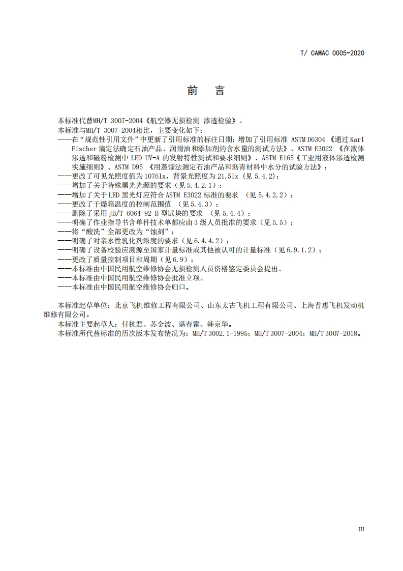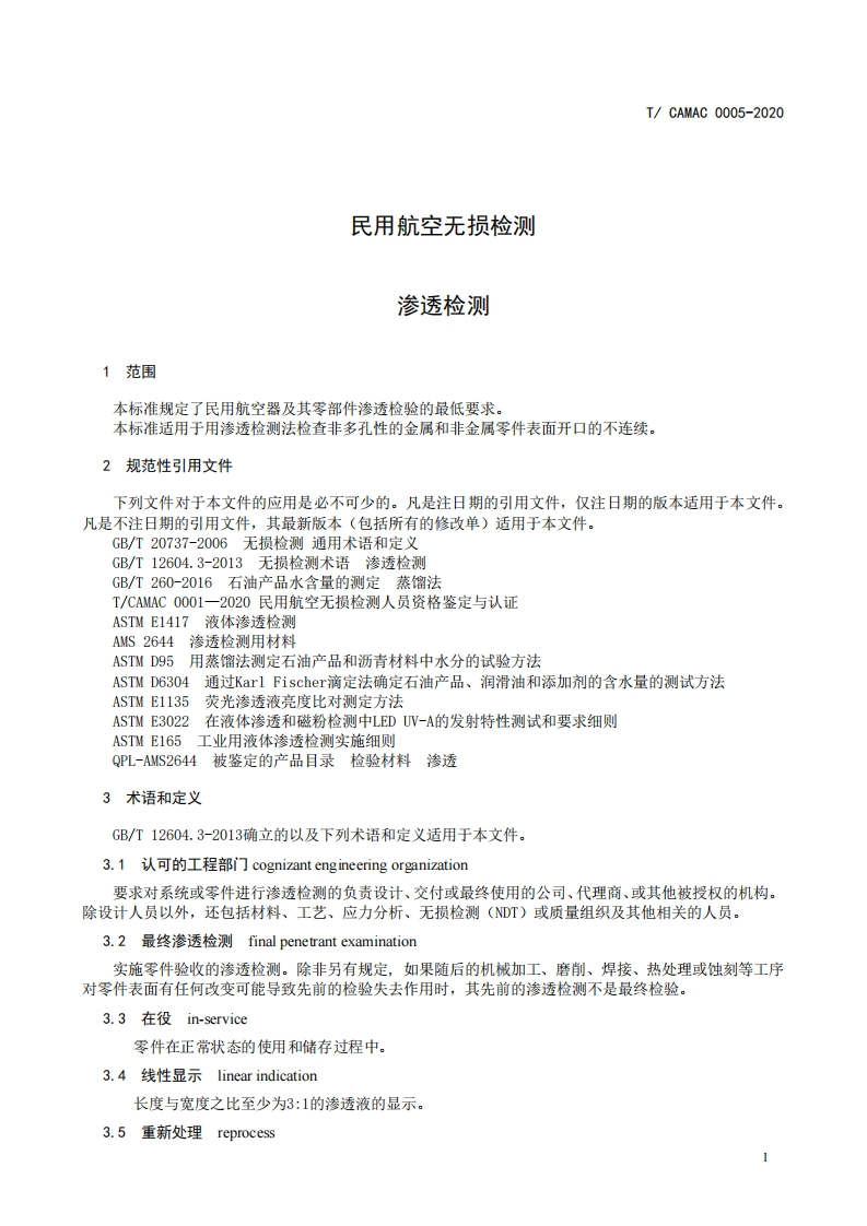 民用航空无损检测渗透检测CivilAviationNondestructiveTestingPenetrantTesting348072@abc15天前发布关注私信0.43MB16页050民用航空无损检测渗透检测CivilAviationNondestructiveTestingPenetrantTesting此内容为付费资源,请付费后查看¥49¥69黄金会员免费钻石会员免费立即购买您当前未登录!建议登陆后购买,可保存购买订单付费资源 第1页 / 共16页 第2页 / 共16页 第3页 / 共16页 第4页 / 共16页 第5页 / 共16页 试读已结束,还剩11页,您可下载完整版后进行离线阅读 THE END标准规范 文本预览 1CS:19.100CCS:H26团体标准T/CAMAC0005-2020民用航空无损检测渗透检测Civil Aviation Nondestructive TestingPenetrant Testing2020年5月12日发布2020年5月18日实施中国民用航空维修协会发布 查看更多 收起部分 喜欢就支持一下吧收藏