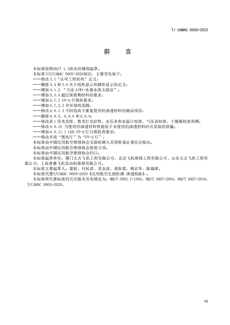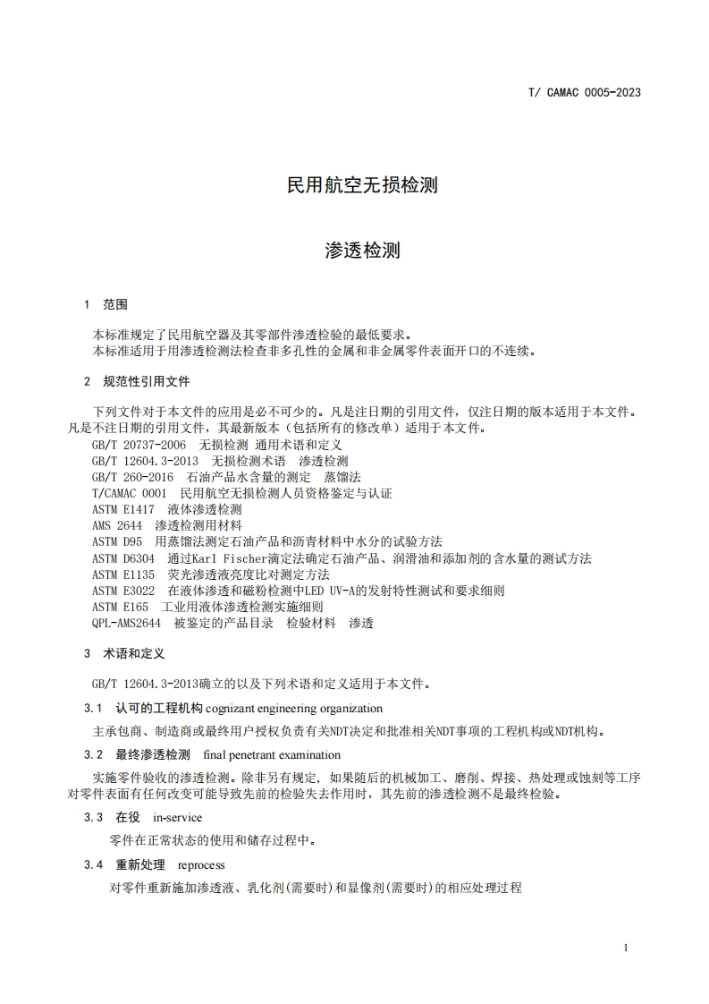民用航空无损检测渗透检测CivilAviationNondestructiveTestingPenetrantTesting_2348072@abc15天前发布关注私信0.44MB17页020民用航空无损检测渗透检测CivilAviationNondestructiveTestingPenetrantTesting_2此内容为付费资源,请付费后查看¥49¥69黄金会员免费钻石会员免费立即购买您当前未登录!建议登陆后购买,可保存购买订单付费资源 第1页 / 共17页 第2页 / 共17页 第3页 / 共17页 第4页 / 共17页 第5页 / 共17页 试读已结束,还剩12页,您可下载完整版后进行离线阅读 THE END标准规范 文本预览 ICS:19.100CCS:H26团体标准T/CAMAC0005-2023民用航空无损检测渗透检测Civil Aviation Nondestructive TestingPenetrant Testing2023年8月7日发布2023年8月14日实施中国民用航空维修协会发布 查看更多 收起部分 喜欢就支持一下吧收藏