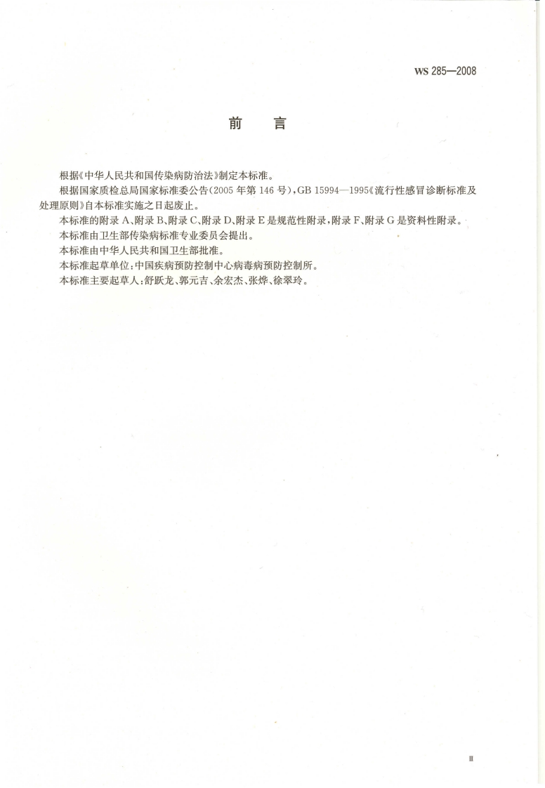 流感诊断标准348072@abc14天前发布关注私信17.89MB34页030流感诊断标准此内容为付费资源,请付费后查看¥49¥69黄金会员免费钻石会员免费立即购买您当前未登录!建议登陆后购买,可保存购买订单付费资源 第1页 / 共34页 第2页 / 共34页 第3页 / 共34页 第4页 / 共34页 第5页 / 共34页 试读已结束,还剩29页,您可下载完整版后进行离线阅读 THE END标准规范 文本预览 ICs11.020c5923226-2008WS中华人民共和国卫生行业标准WS285-2008流行性感冒诊断标准Diagnostic criteria for influenza2008-02-28发布2008-09-01实施人足出来金让P M P H中华人民共和国卫生邵发布 查看更多 收起部分 喜欢就支持一下吧收藏
