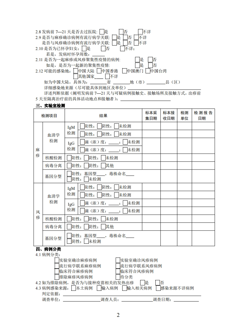 附件1流行病学个案调查表一、基本信息1.1传染病报告卡卡片编号:12患者姓名:(患儿家长姓名:联系电话:13身份证号:1.4性别:☐男□女1.5出生日期:年月日(公历)a年龄:(单位:口岁口月口旧,如出生日期不详,可填写实足年龄)1.6病例分类:儗似病例☐确诊病例☐临床诊断病例口其他监测病例1.7发病日期:20年月日1.8诊断日期:20年月日时1.9死亡日期:20年日1.10疾病名称:法定传染病:1.11填卡医生:1.12报告单位:二、流行病学调查信息2.1报告日期:20年月日2.2病例户籍:口中国大陆口中国香港口中国澳门口中国台湾口其他国家户籍地址(大陆户籍填写):省地(市)县(区)乡(镇、街道)户籍地相对现住址类型:☐体县区☐本市其他县区☐体省其他地市口外省☐港澳台☐外国如非本县区,发病时在现住址居住时间:口k7日☐7一21日□2日一2月□上3月(注:如为外籍或港澳台病例,则选择在中国大陆居住时间)2.3是否在集体单位(学校、幼儿园、工厂等):☐是☐昏☐不详如是,所在集体单位具体名称:2.4是否发热:是不详如是,则发热日期为:20年日2.5是否出疹:是不详如是,则出疹日期为:20日2.6是否有肺炎并发症是☐怀详27含麻疹风疹成分疫苗接种史(须详细填写)剂次(请勾选:□剂☐剂含麻疹风疹成分疫苗接种情况未种原因*□2剂□上3剂☐不详)接种日期疫苗种类*免疫史信息来源*123注:疫苗种类*:1=麻疹/风疹单苗:2=麻风疫苗:3=麻腮风疫苗:4=麻腮疫苗:5=麻腮风水痘联合疫苗:6=不详。免疫史信息来源*:1=接种证:2=接种卡:3=信息系统:4=家长回忆:5其他,请在表格内注明。未种原因*:如为<18岁儿童且未按照免疫程序完成应接种剂次数(注:8一17月龄应已接种1剂,≥18月龄应已接种2剂),其主要原因1=未到接种年龄:2=接种禁忌:3=因疾病延迟接种:4=拒绝接种:5=其他,请在表格内注明。