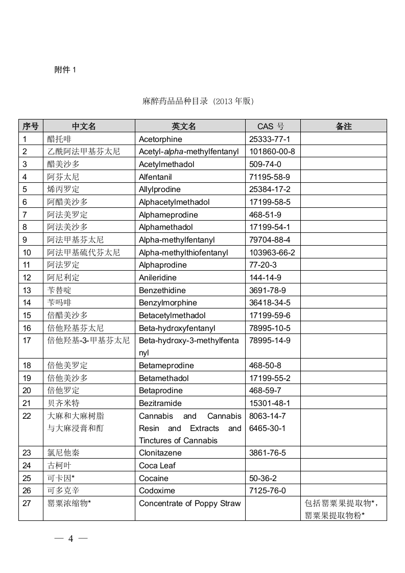 食品药品监管总局公安部国家卫生计生委关于公布麻醉药品和精神药品品种目录的通知食药监药化监〔2013)230号各省、自治区、直辖市食品药品监督管理局、公安厅(局)、卫生厅局(卫生计生委),新疆生产建设兵团食品药品监督管理局、公安局、卫生局:根据《麻醉药品和精神药品管理条例》第三条规定,现公布《麻醉药品品种目录(2013年版)》和《精神药品品种目录(2013年版)》,自2014年1月1日起施行。附件:1.麻醉药品品种目录(2013年版)2.精神药品品种目录(2013年版)国家食品药品监督管理总局中华人民共和国公安部中华人民共和国国家卫生和计划生育委员会2013年11月11日一3