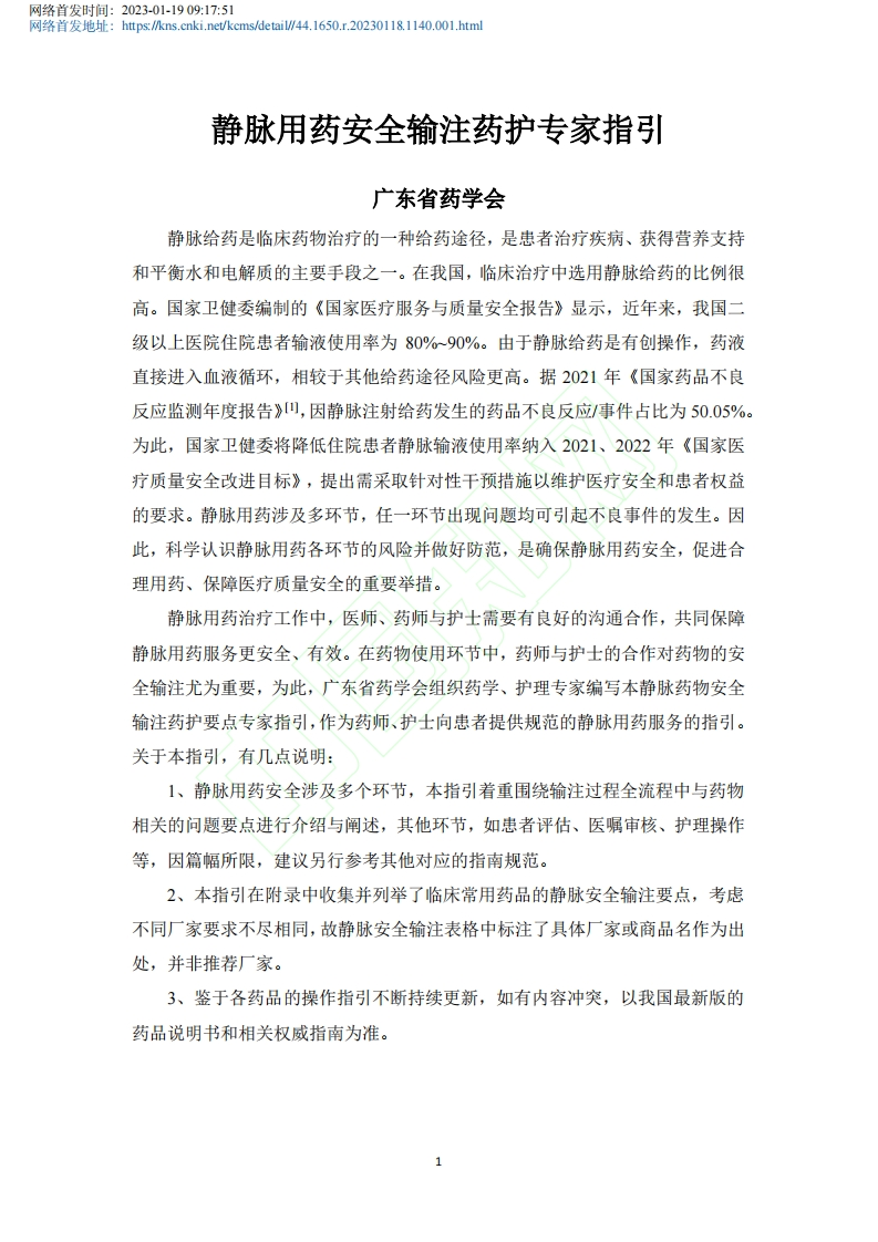 今日药学今日药学Pharacy TodayISSN1674-229X,CN44-1650/R《今日药学》网络首发论文题目:静脉用药安全输注药护专家指引作者:伍俊妍,邱凯锋网络首发日期:2023-01-19引用格式:伍俊妍,邱凯锋.静脉用药安全输注药护专家指引[JOL山.今日药学https://kns.cnki.net/kems/detail//44.1650.r.20230118.1140.001.html回nKit网络首发:在编辑部工作流程中,稿件从录用到出版要经历录用定稿、排版定稿、整期汇编定稿等阶段。录用定稿指内容己经确定,且通过同行评议、主编终审同意刊用的稿件。排版定稿指录用定稿按照期刊特定版式(包括网络呈现版式)排版后的稿件,可暂不确定出版年、卷、期和页码。整期汇编定稿指出版年、卷、期、页码均己确定的印刷或数字出版的整期汇编稿件。录用定稿网络首发稿件内容必须符合《出版管理条例》和《期刊出版管理规定》的有关规定:学术研究成果具有创新性、科学性和先进性,符合编辑部对刊文的录用要求,不存在学术不端行为及其他侵权行为:稿件内容应基本符合国家有关书刊编辑、出版的技术标准,正确使用和统一规范语言文字、符号、数字、外文字母、法定计量单位及地图标注等。为确保录用定稿网络首发的严肃性,录用定稿一经发布,不得修改论文趣目、作者、机构名称和学术内容,只可基于编辑规范进行少量文字的修改。出版确认:纸质期刊编辑部通过与《中国学术期刊(光盘版)》电子杂志社有限公司签约,在《中国学术期刊(网络版)》出版传播平台上创办与纸质期刊内容一致的网络版,以单篇或整期出版形式,在印刷出版之前刊发论文的录用定稿、排版定稿、整期汇编定稿。因为《中国学术期刊(网络版)》是国家新闻出版广电总局批准的网络连续型出版物(1SSN2096-4188,CN11-60372),所以签约期刊的网络版上网络首发论文视为正式出版。