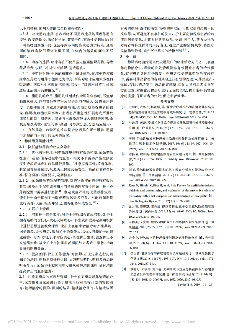 临床合理用药2021年1月第14卷第1期上Chin J of Clinical Rational Drug Use.January202LVd.14Na.1A·165··药事监管·静脉药物治疗的风险控制孟艳斋作者单位:450000郑州市,郑州大学第一附属医院生殖中心【关键词】静脉:药物治疗;药物风险:问题及对策【D0I】10.15887/i.cki.13-H389/r.2021.01.072静脉药物治疗多指静脉输液治疗,指将各种药物(包括血化、光化降解,降低效价,产生颜色和沉淀,毒性增加。避光滴液制品)及血液,通过静脉注入血液循环的治疗方法,是临床注的措施:脱包装即采取避光措施。易发生光化降解的药物治疗中最常用的治疗方式之一"。常用工具包括一次性静脉硝普钠产生毒性物质,需严格避光:硝苯地平、尼莫地平需严格输液钢针,外周静脉留置针、中心静脉导管、经外周静脉置人中避光:水溶性维生素包括B族维生素、维生素C需严格避光:心静脉导管、输液港及输液辅助装置等。静脉药物治疗过程中左氧氟沙星效价下降,不良反应增加,需严格避光。·易氧化的药物风险控制对静脉药物输液治疗成功具有重要的影响,需要药物:肾上腺素、异丙肾上腺素、去甲肾上腺素、多巴胺、氧、金进行有效的管控·在静脉药物治疗中有很多因为药品质量、输属离子,光线、温度可加快氧化:吗啡、两性霉素B需严格避液器材与装置、护理环境因素造成的常见风险:。为保证静光·顺铂、卡铂等抗肿瘤药物、甲钴胺、奥美拉唑、硝酸甘油、长脉药物治疗的安全,在静脉药物治疗期间应对用药问题进行分春地辛等需严格避光“。析,并通过护理管理的方式解决药物风险。1.2.3输液瓶、输液器、注射器的材质:不宜用聚氟乙烯1静脉药物治疗风险问题(PVC)材质输液器输注的药物特性包括:(I)注射剂中含有1.1临床用药风险增溶剂,例如乙醇、丙二醇、苯甲醇、聚氧乙基蓖麻油等:(2)脂1.1.1药师调剂风险:现代医院以药房为基础,对全院各科室肪乳、脂质体等制剂:(3)脂溶性极高的药物:(4)易被PVC材所需药品进行管理,每天各科室医师下达医嘱,由科室统一处质吸附的药物:(5)说明书或文献报道不适宜采用PVC的药理并发送至药房,药师根据各科室药物清单发放药品,由于药物·危害:药物吸附导致含量降低,药效减弱:或增塑剂品零散,量大,且某些药品包装相似,药师在发放过程中存在发(DEHP)加速或过多溶出,错药物的风险。1.2.4胶塞:由于丁基胶塞本身与液体接触,根据我国药用1.1.2护士给药风险:医院临床治疗中,护士工作量巨大,每卤化丁基胶塞标准》规定:10支被测的丁基胶塞,每支分别被天输注大量液体,护士往往不堪重负,以至于在临床治疗给药扎一针,总的肉眼可见的落屑数H(>50m)不超过20粒均中常常出现各种问题日:(1)配药过程中无菌概念薄弱:(2)配被视为合格。置药物时间过早;(3)配置药物的溶媒选择不当:(4)配制药物1.3药品药性的剂量不准确:(5)配置药物方法不正确:(6)未严格按照药物1.3.1药品说明书:是药物最直接的信息来源,是合理用药的的配伍禁忌配置;(7)未注意配置药物的浓度要求:(8)未按要一个重要环节,是医疗纠纷的法定文书。但也存在一些问题,求控制静脉输液滴数:(9)配置或输注过程中未注意避光等特如说明书存在滞后性:同一种药物不同厂家的说明书存在不一殊要求。致情况:医师及护士对药物说明书不了解等。1.1.3患者用药风险:由于患者每天进行大量液体输人,且患1.3.2时辰药理:人体的生理变化具有生物周期性,基础代者文化背景不同,疾病导致患者情绪须躁,某些患者不遵医嘱,谢、体温、血糖和激素分泌等均具有节律性波动,故药物在体内对液体滴数私自调节或弃用等。的药动学、药效学、生物利用度、血药浓度也不同·例如建议晚1.2药品质量风险上使用的药物:平喘药、麻醉性镇痛药、铁剂补血、抗心绞痛药1.2.1温湿度要求:2010年版《中华人民共和国药典》对药品等:建议早上或上午使用的药物:糖皮质激素、抗抑郁药、利尿存储温度规定:冷处(2~10℃),凉暗处(避光并<20℃),阴剂、抗肿瘤药、消化系统药物等。凉处(<20℃),常温处(10~30℃),对生物制品,除另有规定1.3.3用药间隔的制定:合理的间隔可维持有效血药浓度,维外,宜在2~8℃避光保存,不得冷冻。由于药品在生产、运输、持治疗作用,可防止蓄积中毒,药物半衰期是给药间隔的重要存储过程中存在差异,可能产生以下问题:()冷藏药物被冷参数。药物半衰期指药物在体内分布达到平衡后血浆浓度下冻:(2)湿度要求:45%~75%,较难执行:(3)每天2次记录温降50%所需要的时间,反应药物在体内消除的速度。度,执行不力:(4)有些病区至今还将白蛋白、肝素放在冰箱1.3.4相互作用:即两种或多种药物使用时出现的配伍变化,内,需学习:(5)转运过程无保存措施。有些配伍变化可见,在药物使用中逐渐出现,极易引发医疗纠1.2.2避光:光照包括自然光灯、紫外光,可造成药物加速氧纷:不可见配伍变化,产生肉眼无法直接观察到的直径20μm(C)1994-2021 China Academic Journal Electronic Publishing House.All rights reserved.http://www.cnki.net