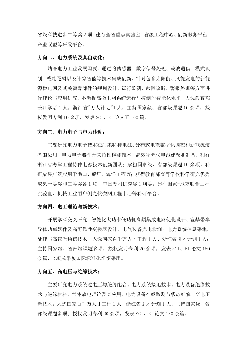 080800电气工程温州大学2015年获批招收电气工程专业方向的硕士研究生,2018年获批电气工程一级学科硕士学位授予权,2019年获首批国家一流本科专业建设点,2019年通过教育部工程教育专业认证。现有电气数字化设计技术国家地方联合工程研究中心等8个国家、省部级科研平台,6个市级科研平台。电气工程学科为浙江省“十二五”重点学科、“十三五”和“十四五”一流学科,2023软科中国最好学科排名全国41名,浙江省属高校排名第一,U.S.News全球排名133,温州大学第一。还建有温州大学乐清工业研究院、智能锁具研究院,科技服务地方电器产业成果陆续被中央电视台《新闻联播》《经济半小时》与《朝闻天下》节目报道。现有浙江省智能电网用低压电器技术重点科技创新团队、浙江省海岸工程特种电源技术创新团队、浙江省高校智能电气技术及应用创新高水平团队、浙江省低压电器产业技术创新战略联盟。有专任教师58人,其中博士生导师10人、正高级职称21人、副高级职称13人、博士44人,具有海外经历的教师22人。拥有国务院特殊津贴专家2人、国家有突出贡献中青年专家1人、国家百千万人才1人、国家优青1人、当代发明家1人、浙江省工业电器产业集群首席专家1人,柔性引进院士1人近年来,学院教师承担国家自然科学基金重点项目、科技创新重大项目课题等国家级项目30余项,承担浙江省重点研发计划项目等省级项目20余项:在国内外学术期刊上发表被SC1、EI等收录论文470余篇。教师科研成果先后获国家科技进步奖二等奖1项,教育部科学技术进步奖一等奖、中国专利奖金奖等省部级科技奖20余项,中国机械工业科学技术奖特等奖等行业科技奖20余项。附一:主要研究方向情况方向一、电机与电器:依托温州千亿级低压电器产业,研究电器理论与智能化、智能低压配电系统、电器与系统可靠性设计:研究具备选择性保护、远程监控等功能的配电系统拓扑理论和组网方法:突破新能源接入、交直流混合分断、电器故障自诊断、电磁兼容、电机驱动与控制等难题。入选浙江省重点科技创新团队1支、工业电器产业集群首席科学家1人:承担国家级、省级重大专项、横向课题等近50项,获得