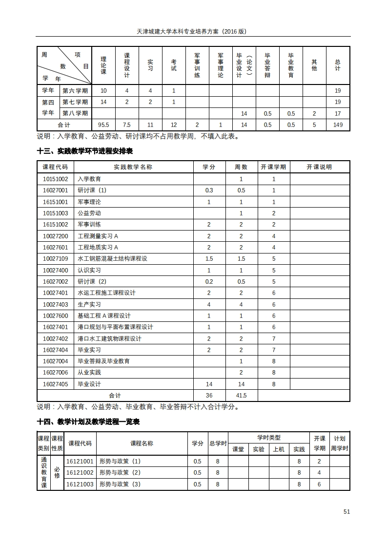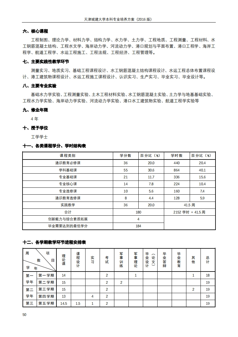 天津城建大学本科专业培养方案(2016版)港口航道与海岸工程专业培养方案一、专业名称及代码中文:港口航道与海岸工程英文:Harbour,Waterway and Coastal Engineering代码:081103二、专业简介港口航道与海岸工程作为土木水利工程的分支,既具备土木水利工程的基本属性,又有因其服务对象和工程环境不同而具有的独特个性。本专业目标是培养基础扎实、知识面宽、实践能力强、综合素质高、具有创新意识和国际视野的复合型应用人才。依托土木工程实验中心,具备完善的力学、流体、测量、建材、岩土、结构等专业基础实验条件。拥有水运工程数值计算实验室和波流水槽一座,配置多套专业软件、吸收式不规则造波机、双向流场模拟系统、多点数据采集系统、流速仪等。三、培养目标本专业培养掌握港口航道与海岸工程学科以及相关的工程管理、技术经济、人文科学等方面知识,具备计算机和外语的应用能力,获得工程师的基本训练,能在港口工程、航道工程、海岸工程、近海工程以及相近的水利工程、海洋工程、土木工程等领域从事规划、勘测、设计、施工、科研、技术开发、技术管理等方面工作的港口航道与海岸工程学科复合型应用人才。四、培养要求本专业学生主要学习港口航道与海岸工程方面的基本知识和基础理论,受到工程制图、计算机应用、结构设计、施工实践、专业实验等方面的基本训练,掌握工程施工、项目管理、工程设计、实验测试、科学运算等方面的基本能力,具备良好的道德、文化、专业、心理等方面的素质。毕业生应获得以下几个方面的素质、知识和能力:1具有良好的工程职业道德、高度的社会责任感和丰富的人文社会科学素养;2具有从事工程工作所需的相关数学、自然科学以及经济、管理知识:3.掌握工程基础知识和港口航道与海岸工程学科的基本理论知识,具有系统的工程实践学习经历;4.具备设计和实施工程实验的能力,并能够对实验结果进行分析;5掌握基本的创新方法,具有追求创新的态度和意识,具有一定的批判性思维能力;具有综合运用理论和技术手段设计系统和过程的能力,工程实施过程中能够综合考虑经济、环境、法律、安全、健康、伦理等制约因素;6掌握文献检索、资料查询及运用现代信息技术获取相关信息的基本方法:7具有一定的组织管理能力、表达能力和人际交往能力以及在团队中发挥作用的能力:8.了解与港口航道与海岸工程学科相关的职业和行业的生产、设计、研究与开发、环境保护和可持续发展等方面的方针、政策和法津、法规,能正确认识工程对于客观世界和社会的影响:9.了解水利工程及相近的土木工程、海洋工程的理论前沿和发展动态;10.对终身学习有正确认识,具有不断学习和适应发展的能力:11.具有国际视野和跨文化的交流、竞争与合作能力。五、主干学科土木工程、水利工程、海洋工程49
